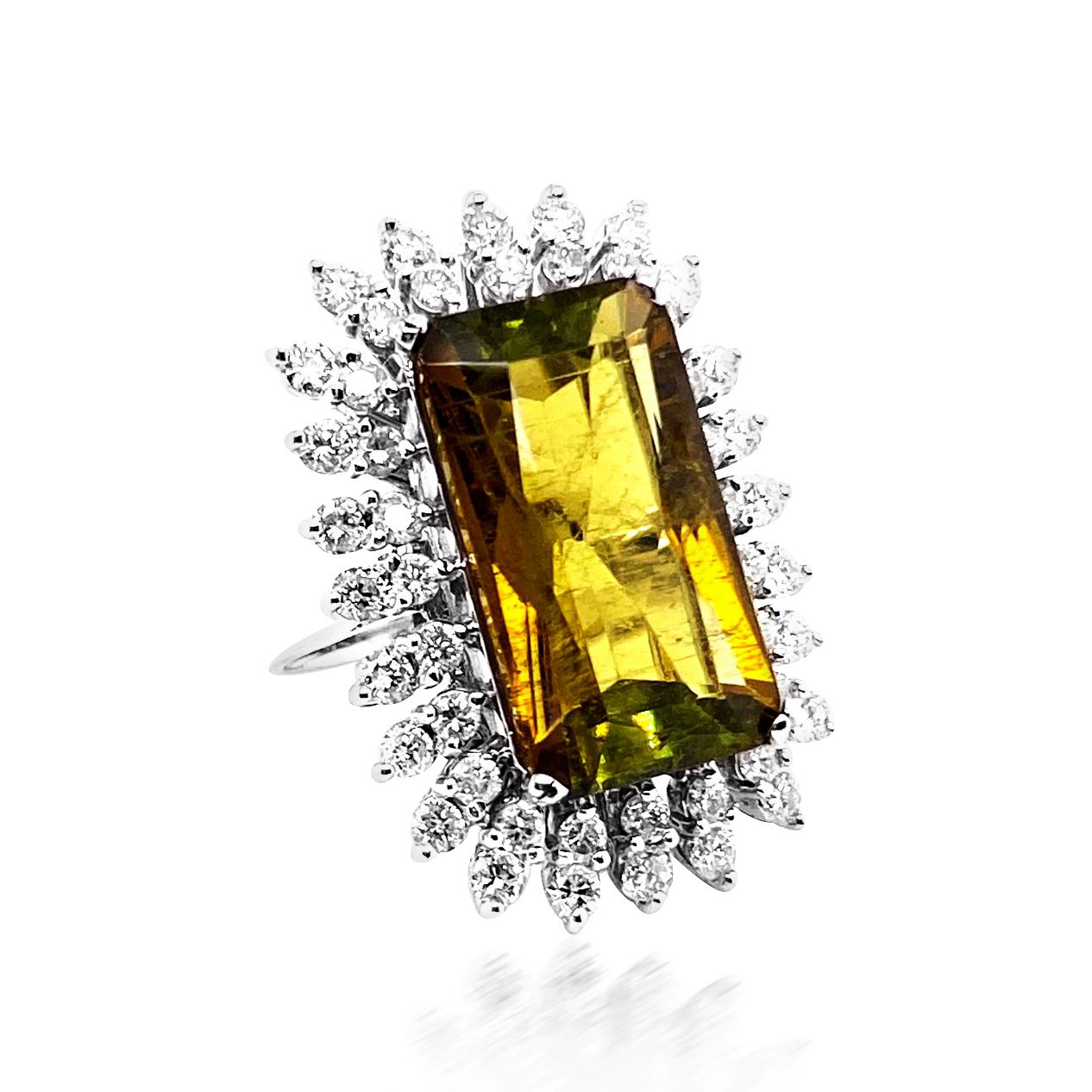 14K W/G NATURAL COPPER BEARING PARAIBA TYPE TOURMALINE RING :10.18GRAM /COPPER BEARING PARAIBA TYPE TOURMALINE :16.43CT/DIAMOND RD: 2.03CT/#GVR1296 **Ideal for channeling nature's healing power, this remarkable 16.43 carat Emerald cut Paraiba Green Tourmaline demands to be seen. Artfully crafted in 14k white gold and surrounded by a sparkling burst of 2.03 carat round cut Diamonds, it twinkles with delight for all to behold, invoking images of timeless glamour and elegance. this gorgeous ring is an investment piece and secure purchase, sure to last a lifetime.**