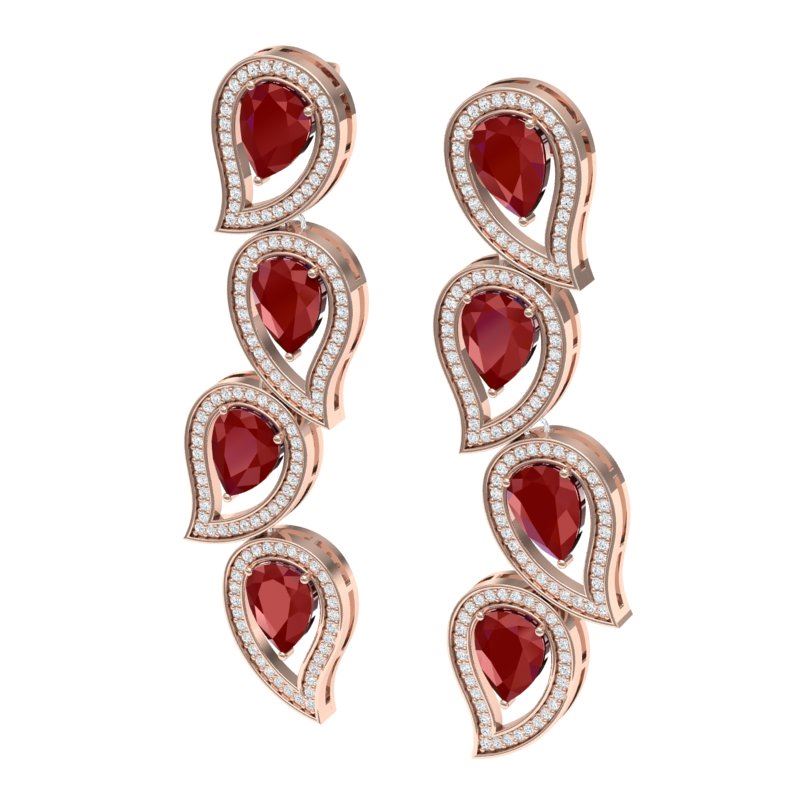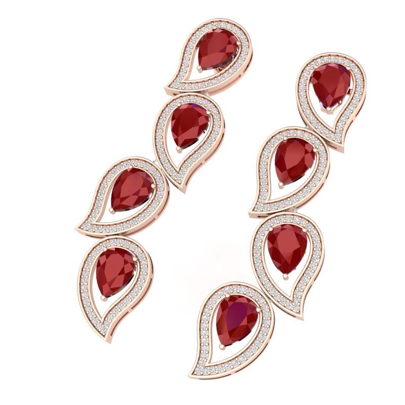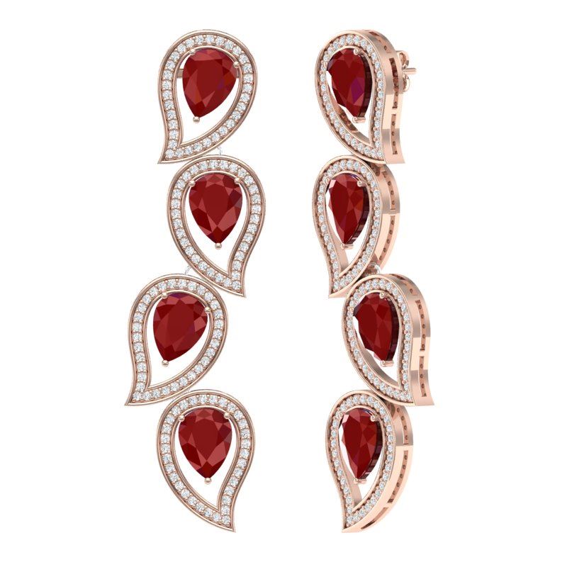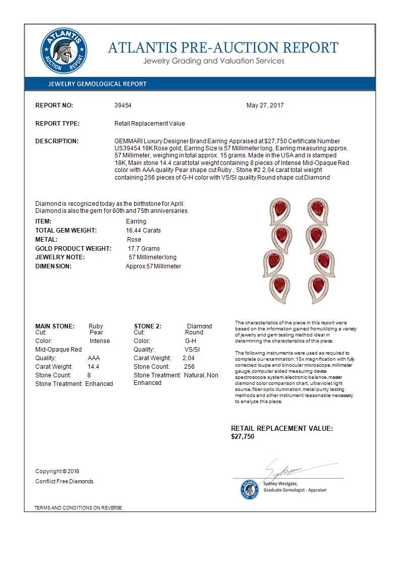 16.44 CTW Royalty Designer Ruby & VS Diamond Earrings 18K Rose Gold ---- Luxury Designer Brand Earring Appraised Retail Price at $27,750 ---- SKU Number US39454 18K Rose gold Earring Size is 57 Millimeter long, Earring measuring approx. 57 Millimeter, weighing in total approx. 15 grams. Made in the USA and is stamped 18K, Main stone 14.4 carat total weight containing 8 pieces of Intense Mid-Opaque Red color with AAA quality Pear shape cut Ruby , Stone #2 2.04 carat total weight containing 256 pieces of G-H color with VS/SI quality Round shape cut