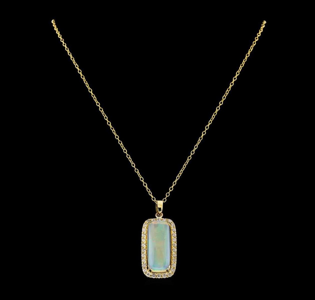 One electronically tested 14KT yellow gold lady's combination cast & assembled fashion pendant & chain 18.0' long, 1.9mm twisted oval shape link with a lobster claw clasp with a bright polish finish. Identified with markings of 'K14'. Condition is new, good workmanship. Containing: One crystal opal that is cut in a rectangular cus shaped cabochon and is prong set, measuring 26.40 mm long x 12.06 mm wide, and 8.20 mm thick and the approximate weight is 16.45 carats. The opal has a somewhat bright, multicolor play of color (fire) in a rolling flashfire pattern; a high dome; a good cut; no inclusions; consistent in its brightness and pattern; and is not directional. Graded in the setting. Thirty prong set round brilliant cut diamonds, measuring 2.10 - 2.00 x 1.25mm (depth est.) approximate total weight of 30 Stones = 0.96ct. Graded in the setting. Clarity SI-1 to SI-2. Color: G - H Cut Good. Total Weight of Diamonds 0.96ct.. Total Weight of Opals 16.45ct.. Total Weight of Pendant & Chain 15.70gm. GAS Appraised.
