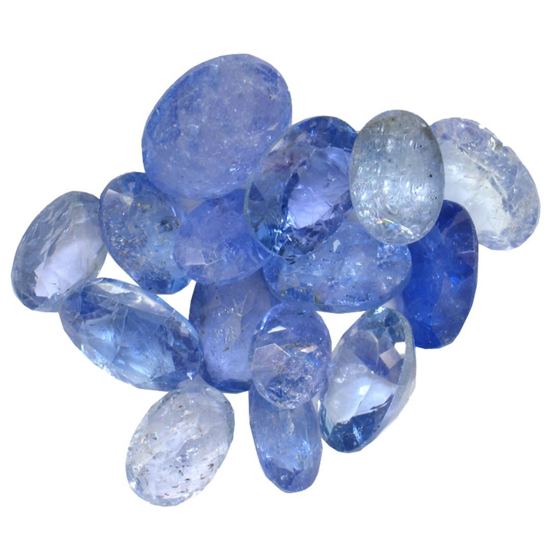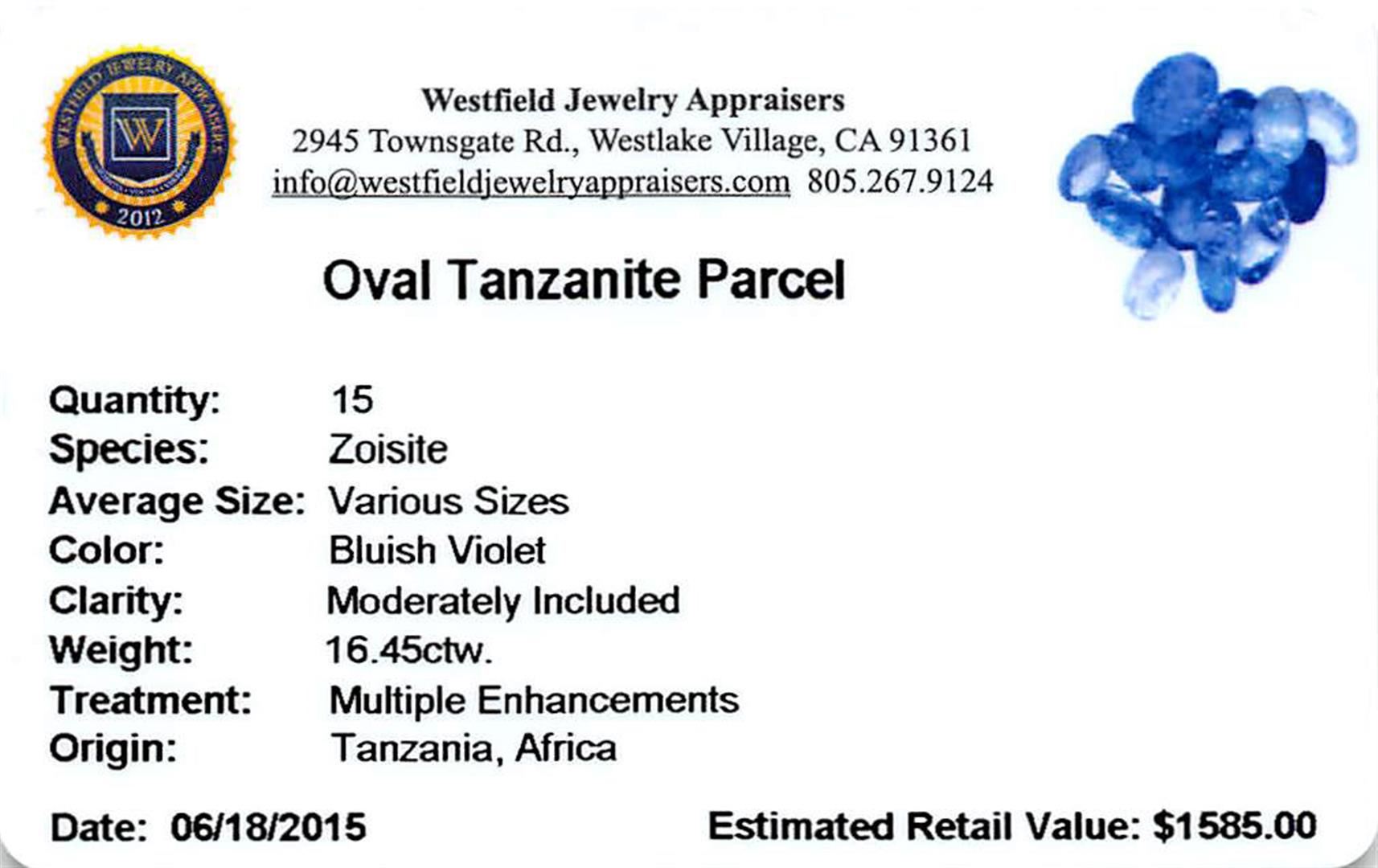 Fifteen oval mixed cut natural tanzanites exact total weight 16.45ct., clarity is moderately included, type I, medium dark, very slightly grayish, bluish violet color, (GIA bV 6/3), cut is good. Transmitting light with a minimum of distortion, transparent. Naturally occurring internal & external characteristics are present. Color grade is an average for the group. Tanzanite is a very rare gemstone that is only found in the country of Tanzania. Originally discovered in 1967. Tiffany & Company, named the stone Tanzanite. It is found in the Usumburu Mountains that border the Umba Valley of northern Tanzania. Tanzanite occurs in gray, brown, violet, blue, reddish-purple, & green. The gem is interesting because of its exceptional pleochroism. Rotated in different directions a tanzanite will exhibit multiple changes of color. Tanzanite has a low tolerance to ultrasonic cleaning, and should not be cleaned using this method. Westfield Appraised at $1,585.00.