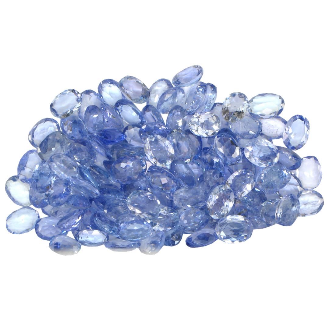 Ninety oval mixed cut natural tanzanites, measuring 4.00 x 3.00 x 1.95mm, exact total weight 16.46ct., clarity is eye clean, type I, medium dark, very slightly grayish, bluish violet color, (GIA bV 6/3), cut is good. Transmitting light with no distortion, transparent. Color grade is an average for the group. Graded in the setting. Tanzanite is a very rare gemstone that is only found in the country of Tanzania. Originally discovered in 1967. Tiffany & Company, named the stone Tanzanite. It is found in the Usumburu Mountains that border the Umba Valley of northern Tanzania. Tanzanite occurs in gray, brown, violet, blue, reddish-purple, & green. The gem is interesting because of its exceptional pleochroism. Rotated in different directions a tanzanite will exhibit multiple changes of color. Tanzanite has a low tolerance to ultrasonic cleaning, and should not be cleaned using this method. Westfield Appraised at $1,585.00.
