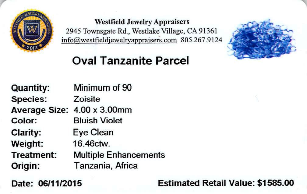 Ninety oval mixed cut natural tanzanites, measuring 4.00 x 3.00 x 1.95mm, exact total weight 16.46ct., clarity is eye clean, type I, medium dark, very slightly grayish, bluish violet color, (GIA bV 6/3), cut is good. Transmitting light with no distortion, transparent. Color grade is an average for the group. Graded in the setting. Tanzanite is a very rare gemstone that is only found in the country of Tanzania. Originally discovered in 1967. Tiffany & Company, named the stone Tanzanite. It is found in the Usumburu Mountains that border the Umba Valley of northern Tanzania. Tanzanite occurs in gray, brown, violet, blue, reddish-purple, & green. The gem is interesting because of its exceptional pleochroism. Rotated in different directions a tanzanite will exhibit multiple changes of color. Tanzanite has a low tolerance to ultrasonic cleaning, and should not be cleaned using this method. Westfield Appraised at $1,585.00.