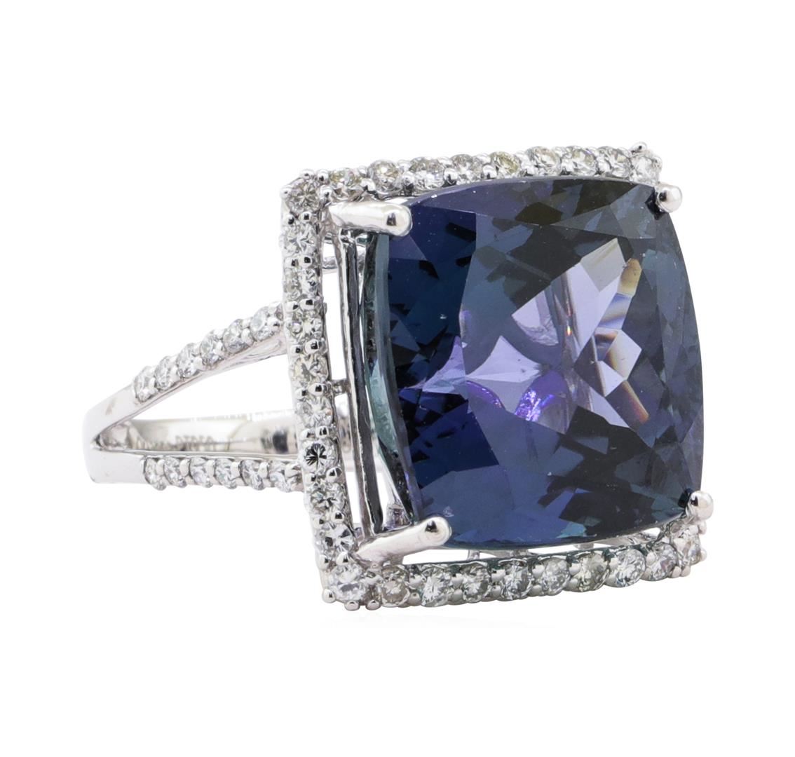One electronically tested platinum ladies cast & assembled tanzanite & diamond ring. The ring features a tanzanite set within a diamond bezel, supported by an elaborate lattice under gallery and diamond set split shoulders, completed by a two and one half millimeter wide band. Bright polish finish. Trademark is Orianne. Identified with markings of "PT950". Condition is new, good workmanship. Containing: One prong set cushion modified brilliant cut natural tanzanite, measuring 14.12 x 13.57 x 9.12mm, exact weight 16.46ct., clarity is eye clean, type I, medium dark, very slightly grayish, violetish blue color, (GIA vB 6/3), cut is good. Transmitting light with no distortion, transparent. GIA Gemological Report attached. Graded loose prior to setting in the GIA Laboratory, Report #2175870448.Tanzanite is a very rare gemstone that is only found in the country of Tanzania. Originally discovered in 1967. Tiffany & Company, named the stone Tanzanite. It is found in the Usumburu Mountains that border the Umba Valley of northern Tanzania. Tanzanite occurs in gray, brown, violet, blue, reddish-purple, & green. The gem is interesting because of its exceptional pleochroism. Rotated in different directions a tanzanite will exhibit multiple changes of color. Tanzanite has a low tolerance to ultrasonic cleaning, and should not be cleaned using this method. Sixty prong set round brilliant cut diamonds exact total weight 60 Stones = 0.81ct. Graded in the setting. Clarity SI-1 to I-1 Color F - H Total Weight of Colored Stones 16.46 ct. Total Weight of Diamonds 0.81 ct. Total Weight of Ring 10.10 gm Estimated Retail Value $ 40,210.00 US