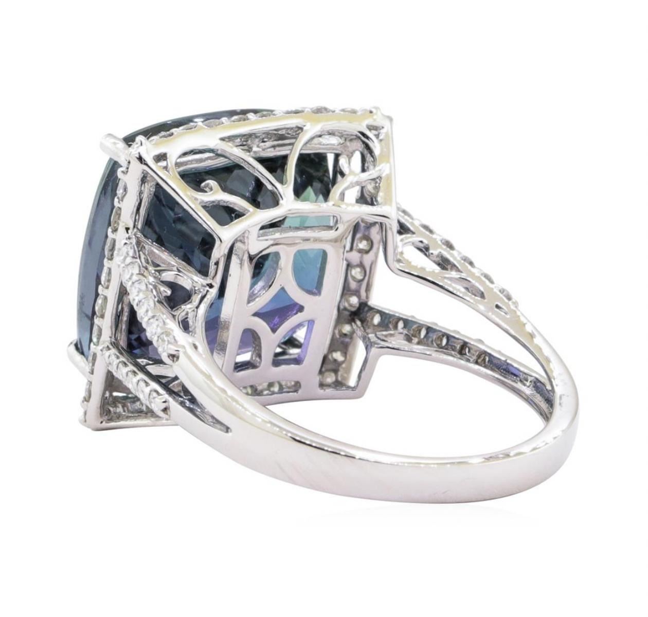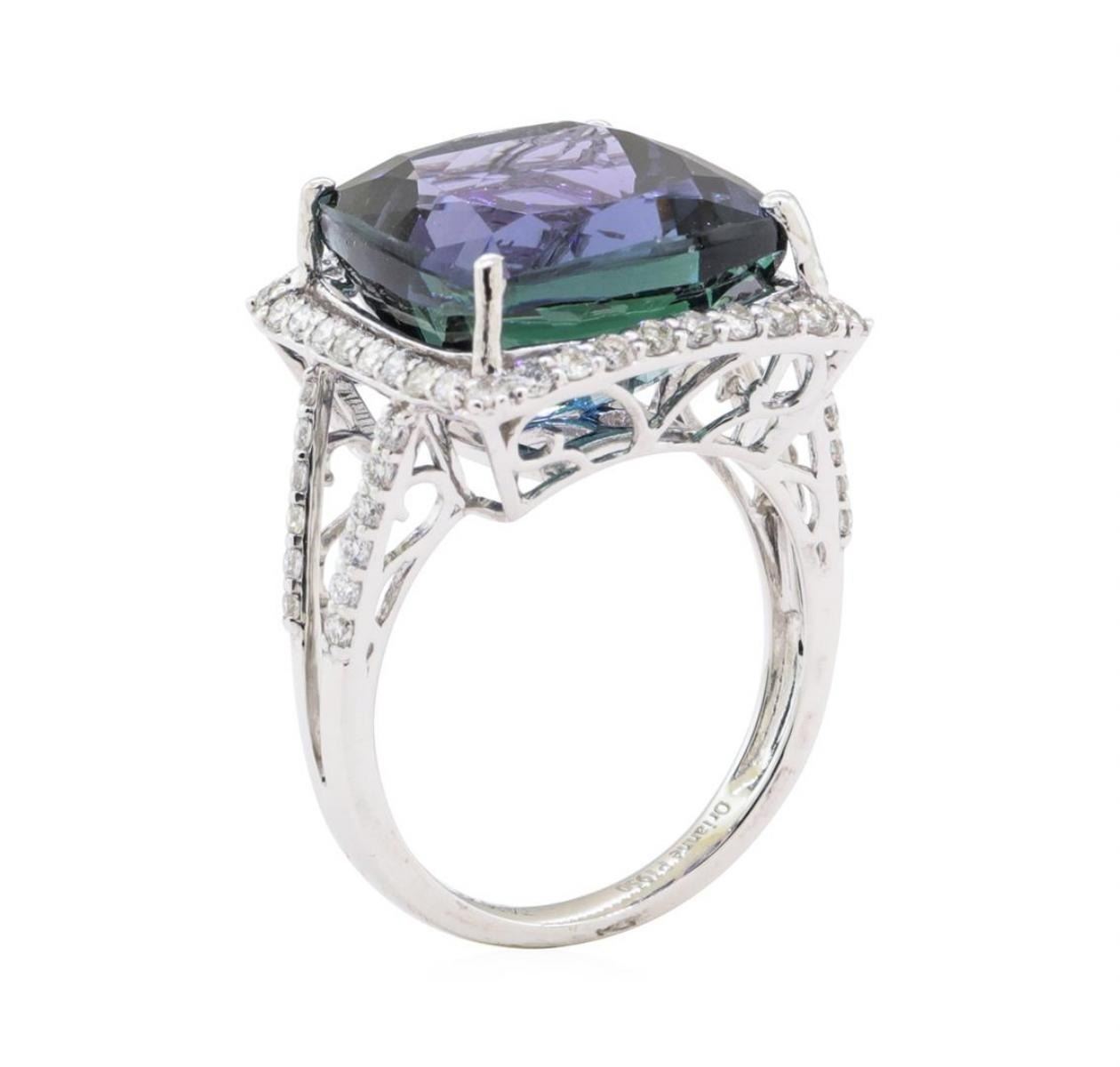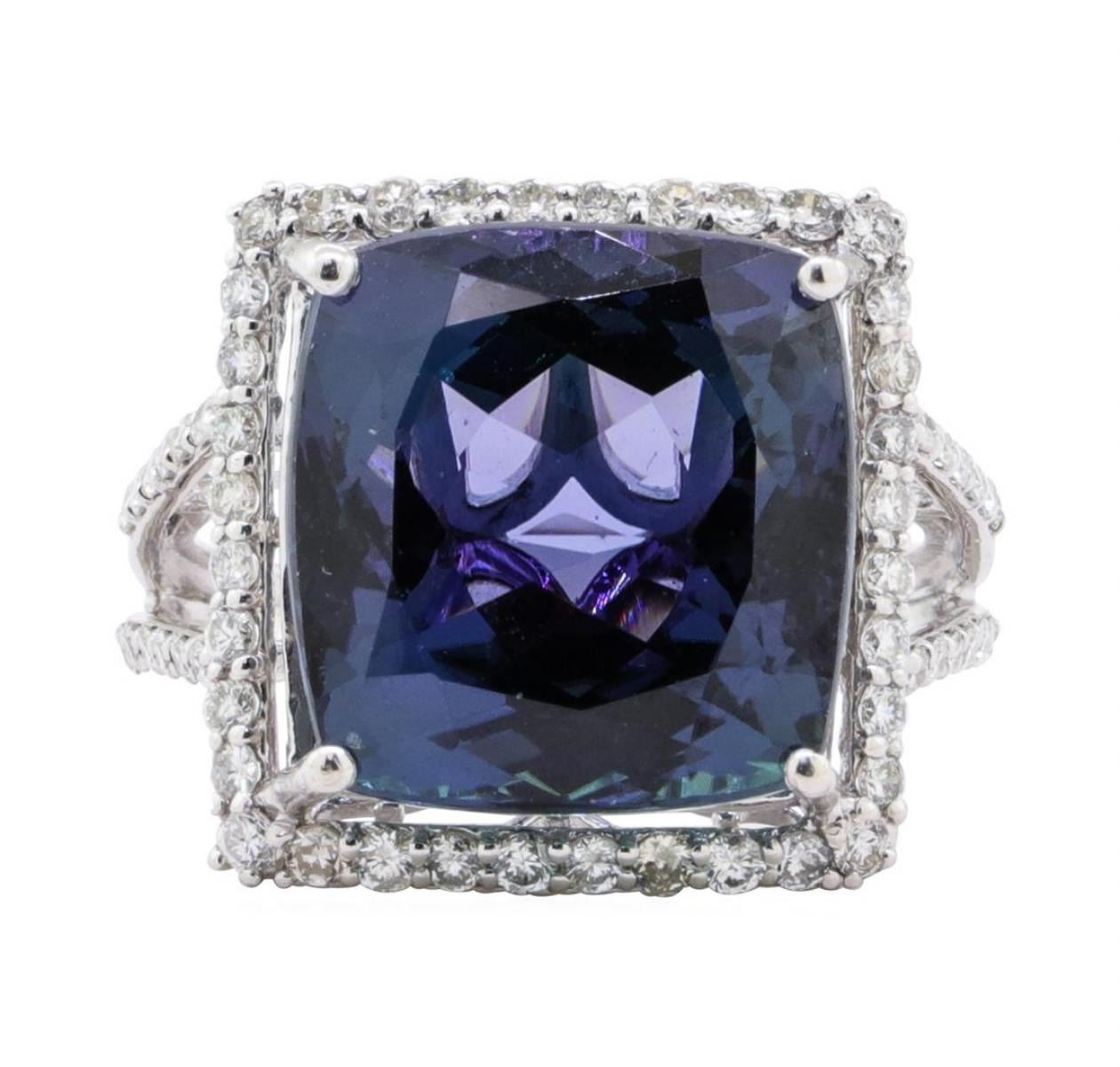 One electronically tested platinum ladies cast & assembled tanzanite & diamond ring. The ring features a tanzanite set within a diamond bezel, supported by an elaborate lattice under gallery and diamond set split shoulders, completed by a two and one half millimeter wide band. Bright polish finish. Trademark is Orianne. Identified with markings of "PT950". Condition is new, good workmanship. Containing: One prong set cushion modified brilliant cut natural tanzanite, measuring 14.12 x 13.57 x 9.12mm, exact weight 16.46ct., clarity is eye clean, type I, medium dark, very slightly grayish, violetish blue color, (GIA vB 6/3), cut is good. Transmitting light with no distortion, transparent. GIA Gemological Report attached. Graded loose prior to setting in the GIA Laboratory, Report #2175870448.Tanzanite is a very rare gemstone that is only found in the country of Tanzania. Originally discovered in 1967. Tiffany & Company, named the stone Tanzanite. It is found in the Usumburu Mountains that border the Umba Valley of northern Tanzania. Tanzanite occurs in gray, brown, violet, blue, reddish-purple, & green. The gem is interesting because of its exceptional pleochroism. Rotated in different directions a tanzanite will exhibit multiple changes of color. Tanzanite has a low tolerance to ultrasonic cleaning, and should not be cleaned using this method. Sixty prong set round brilliant cut diamonds exact total weight 60 Stones = 0.81ct. Graded in the setting. Clarity SI-1 to I-1 Color F - H Total Weight of Colored Stones 16.46 ct. Total Weight of Diamonds 0.81 ct. Total Weight of Ring 10.10 gm Estimated Retail Value $ 40,210.00 US