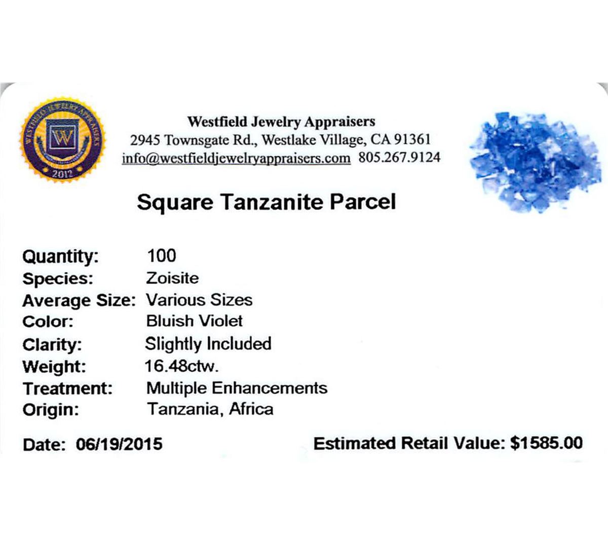 One hundred square mixed cut natural tanzanites exact total weight 16.48ct., clarity is slightly included, type I, medium dark, very slightly grayish, bluish violet color, (GIA bV 6/3), cut is good. Transmitting light with a minimum of distortion, transparent. Naturally occurring internal & external characteristics are present. Color grade is an average for the group. Tanzanite is a very rare gemstone that is only found in the country of Tanzania. Originally discovered in 1967. Tiffany & Company, named the stone Tanzanite. It is found in the Usumburu Mountains that border the Umba Valley of northern Tanzania. Tanzanite occurs in gray, brown, violet, blue, reddish-purple, & green. The gem is interesting because of its exceptional pleochroism. Rotated in different directions a tanzanite will exhibit multiple changes of color. Tanzanite has a low tolerance to ultrasonic cleaning, and should not be cleaned using this method. Westfield Appraised at $1,585.00.