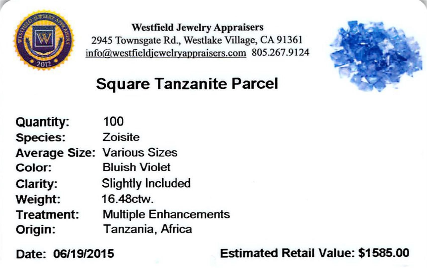 One hundred square mixed cut natural tanzanites exact total weight 16.48ct., clarity is slightly included, type I, medium dark, very slightly grayish, bluish violet color, (GIA bV 6/3), cut is good. Transmitting light with a minimum of distortion, transparent. Naturally occurring internal & external characteristics are present. Color grade is an average for the group. Tanzanite is a very rare gemstone that is only found in the country of Tanzania. Originally discovered in 1967. Tiffany & Company, named the stone Tanzanite. It is found in the Usumburu Mountains that border the Umba Valley of northern Tanzania. Tanzanite occurs in gray, brown, violet, blue, reddish-purple, & green. The gem is interesting because of its exceptional pleochroism. Rotated in different directions a tanzanite will exhibit multiple changes of color. Tanzanite has a low tolerance to ultrasonic cleaning, and should not be cleaned using this method. Westfield Appraised at $1,585.00.