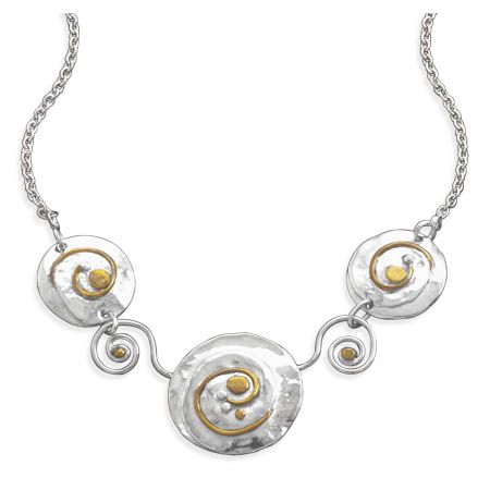 16.5” + 1.5” extension sterling silver necklace with 3 disc and coil design. Two of the discs measure 16mm and the center disc is 22mm and have 14 karat gold plated accents. The necklace has a lobster clasp closure. .925 Sterling Silver