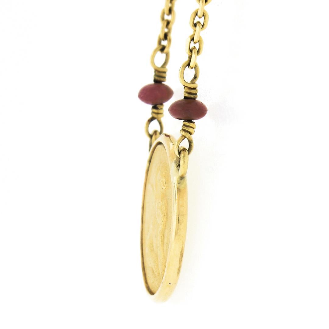 A solid 14k yellow gold necklace with 18k yellow gold pendant, with 12 rondelle bead shape natural rubies (3.12mm each). 16.5 inch by the yard cable link chain, 4.48 grams total weight, pendant diameter measures 13.3mm.