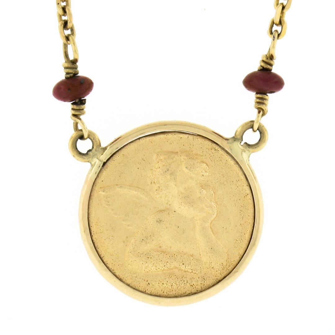 A solid 14k yellow gold necklace with 18k yellow gold pendant, with 12 rondelle bead shape natural rubies (3.12mm each). 16.5 inch by the yard cable link chain, 4.48 grams total weight, pendant diameter measures 13.3mm.