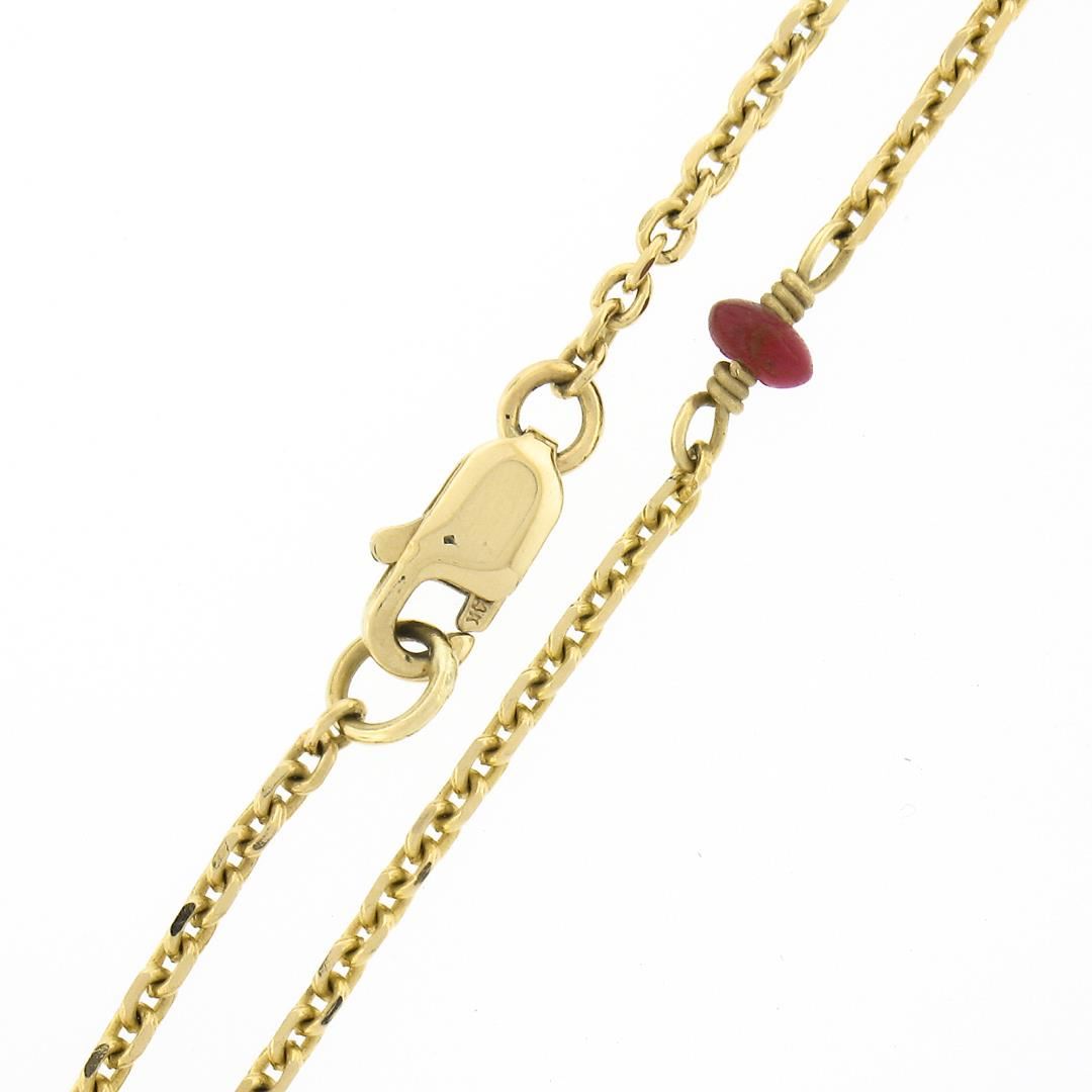 A solid 14k yellow gold necklace with 18k yellow gold pendant, with 12 rondelle bead shape natural rubies (3.12mm each). 16.5 inch by the yard cable link chain, 4.48 grams total weight, pendant diameter measures 13.3mm.