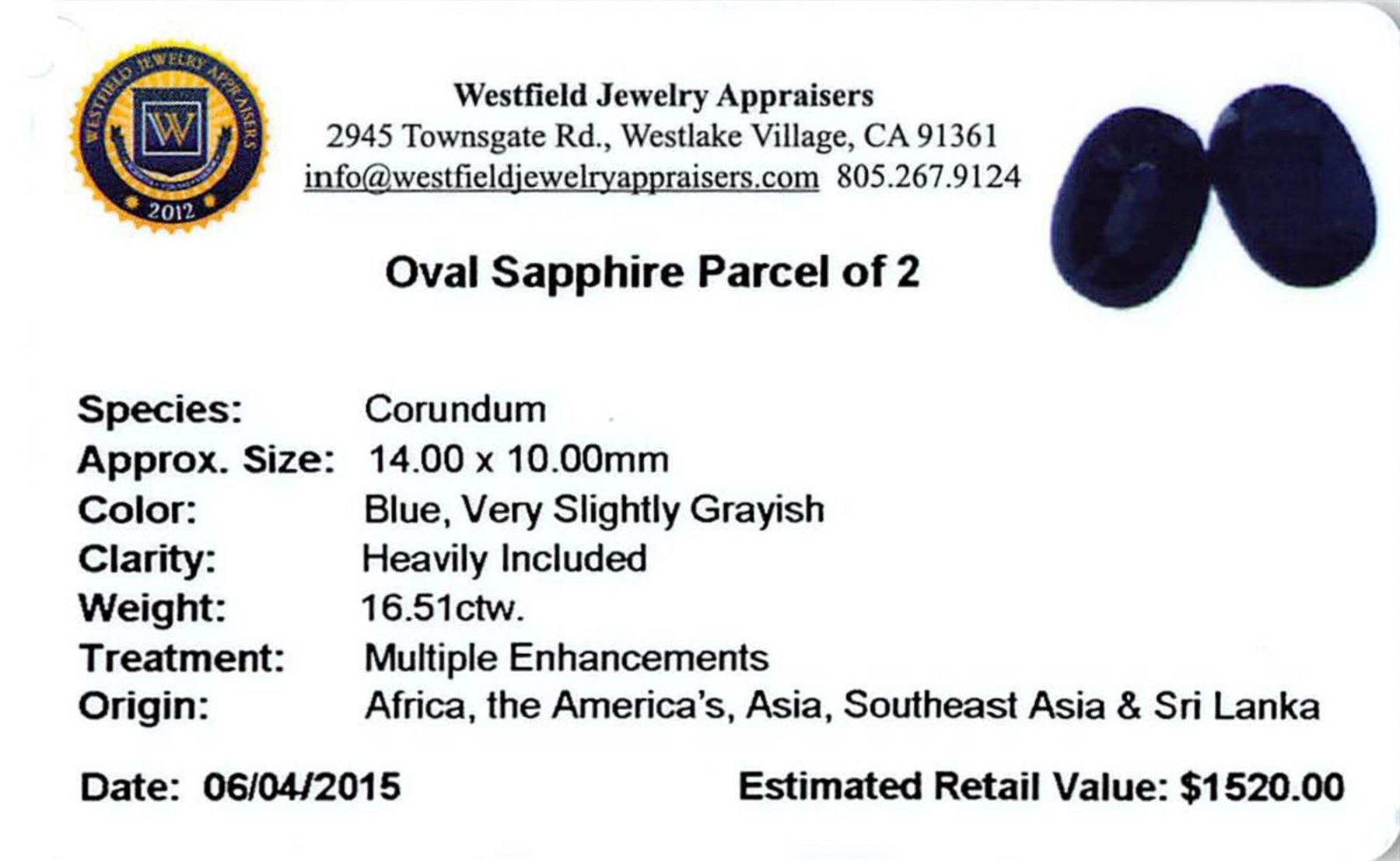 Two oval mixed cut natural blue sapphires, measuring 14.00 x 10.00 x 6.50mm, exact total weight 16.51ct., clarity is heavily included, type II, very dark, very slightly grayish, blue color, (GIA B 8/3), cut is good. Measurements are an average for the group. Transmitting light very diffusely, opaque, Naturally occurring internal & external characteristics are present, Indications of multiple laboratory enhancements, including high temperature heat treatment. Westfield Appraised.