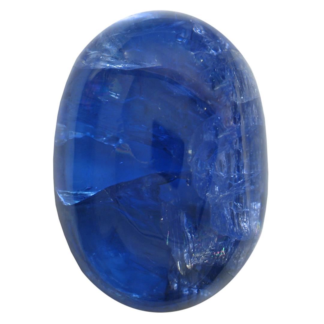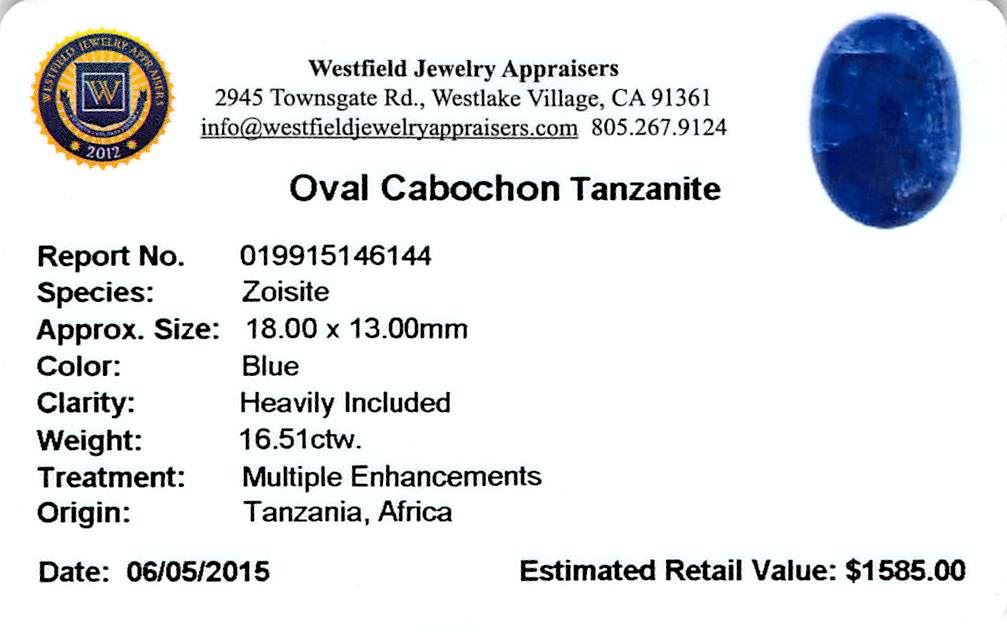 One oval cabochon cut natural tanzanite, measuring 18.00 x 13.00 x 7.00mm, exact weight 16.51ct., clarity is heavily included, type I, dark, very slightly grayish, blue color, (GIA B 7/3), cut is good. Transmitting light somewhat diffusely, transparen Westfield Appraised at $1,585.00.