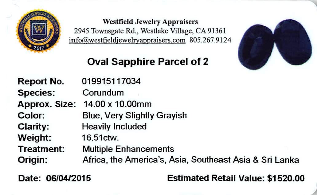 Two oval mixed cut natural blue sapphires, measuring 14.00 x 10.00 x 6.50mm, exact total weight 16.51ct., clarity is heavily included, type II, very dark, very slightly grayish, blue color, (GIA B 8/3), cut is good. Measurements are an average for the group. Transmitting light very diffusely, opaque, Naturally occurring internal & external characteristics are present, Indications of multiple laboratory enhancements, including high temperature heat treatment. Westfield Appraised at $1,520.00.