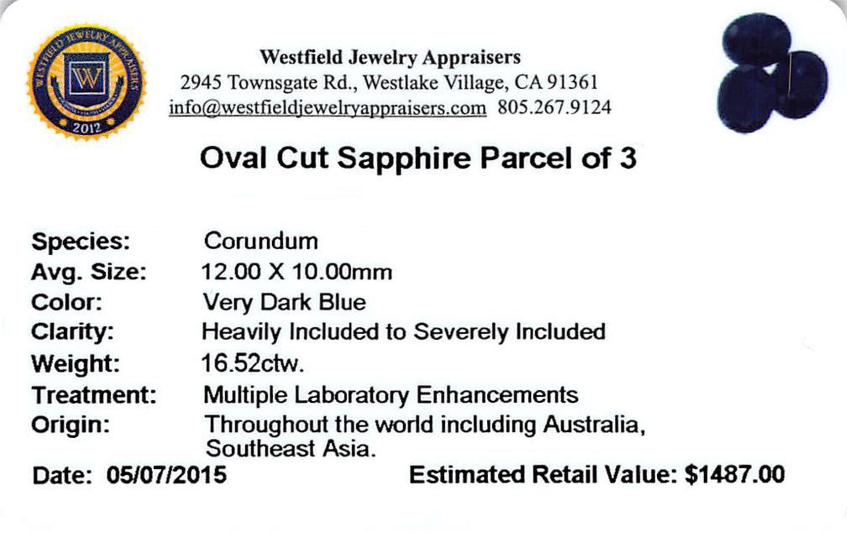 Three oval cut sapphires, measuring 12.00 x 10.00mm, approximate total weight of 16.52ct., clarity is heavily included to severely included, very dark blue color. Indications of multiple laboratory enhancements. Westfield Appraised.
