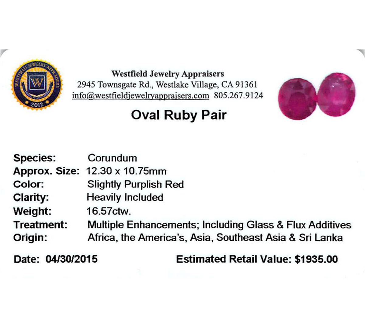 Two oval mixed cut natural rubies, measuring 12.30 x 10.75 x 6.40mm, approximate total weight of 16.57ct., clarity is heavily included, type II, dark, very slightly brownish, slightly purplish red color, (GIA slpR 7/3), cut is good. Transmitting light somewhat diffusely, translucent. Naturally occurring internal & external characteristics are present. Indications of laboratory high temperature heat treatment, with glass & flux additives. Ruby has a low tolerance to rhodium plating, repolishing the surface, & ultrasonic cleaning. Westfield Appraised at $1,935.00.