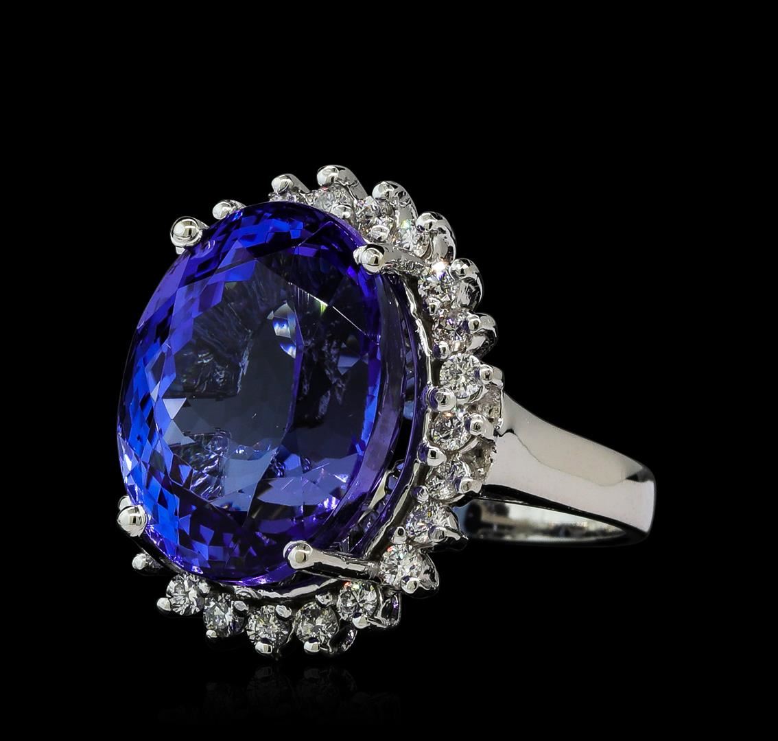 One electronically tested 14KT white gold lady's cast fashion ring with a basket halo with a bright polish finish. The featured lady's ring has a shank measuring 2.46 millimeters wide. Identified with markings of '14K'. Condition is new, good workmanship. Containing: One prong set oval modified brilliant cut natural tanzanite, measuring 16.15 x 12.45 x 10.21mm, (depth est.) 15%. bulge factor, approximate weight of 16.57ct., clarity is eye clean, medium dark, moderately strong, violetish blue color, (GIA vB 6/4), cut is very good. Transmitting light with no distortion, transparent. Colored gemstones are presumed to have been subjected to commonly used enhancement processes. Graded in the setting. Twenty-Four prong set round brilliant cut diamonds, measuring 1.90 - 1.80 x 1.13mm (depth est.) approximate total weight of 24 Stones = 0.56ct. Graded in the setting. Clarity SI-1 to I-1. Color: G - H Cut Good. Total Weight of Colored Stones 16.57ct.. Total Weight of Diamonds 0.56ct.. Total Weight of Ring 9.70gm. GAS Appraised at $27,655.00.