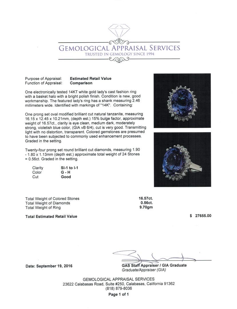 One electronically tested 14KT white gold lady's cast fashion ring with a basket halo with a bright polish finish. The featured lady's ring has a shank measuring 2.46 millimeters wide. Identified with markings of '14K'. Condition is new, good workmanship. Containing: One prong set oval modified brilliant cut natural tanzanite, measuring 16.15 x 12.45 x 10.21mm, (depth est.) 15%. bulge factor, approximate weight of 16.57ct., clarity is eye clean, medium dark, moderately strong, violetish blue color, (GIA vB 6/4), cut is very good. Transmitting light with no distortion, transparent. Colored gemstones are presumed to have been subjected to commonly used enhancement processes. Graded in the setting. Twenty-Four prong set round brilliant cut diamonds, measuring 1.90 - 1.80 x 1.13mm (depth est.) approximate total weight of 24 Stones = 0.56ct. Graded in the setting. Clarity SI-1 to I-1. Color: G - H Cut Good. Total Weight of Colored Stones 16.57ct.. Total Weight of Diamonds 0.56ct.. Total Weight of Ring 9.70gm. GAS Appraised at $27,655.00.