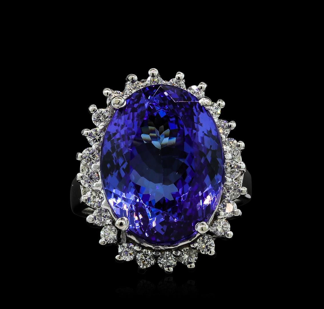 One electronically tested 14KT white gold lady's cast fashion ring with a basket halo with a bright polish finish. The featured lady's ring has a shank measuring 2.46 millimeters wide. Identified with markings of '14K'. Condition is new, good workmanship. Containing: One prong set oval modified brilliant cut natural tanzanite, measuring 16.15 x 12.45 x 10.21mm, (depth est.) 15%. bulge factor, approximate weight of 16.57ct., clarity is eye clean, medium dark, moderately strong, violetish blue color, (GIA vB 6/4), cut is very good. Transmitting light with no distortion, transparent. Colored gemstones are presumed to have been subjected to commonly used enhancement processes. Graded in the setting. Twenty-Four prong set round brilliant cut diamonds, measuring 1.90 - 1.80 x 1.13mm (depth est.) approximate total weight of 24 Stones = 0.56ct. Graded in the setting. Clarity SI-1 to I-1. Color: G - H Cut Good. Total Weight of Colored Stones 16.57ct.. Total Weight of Diamonds 0.56ct.. Total Weight of Ring 9.70gm. GAS Appraised at $27,655.00.