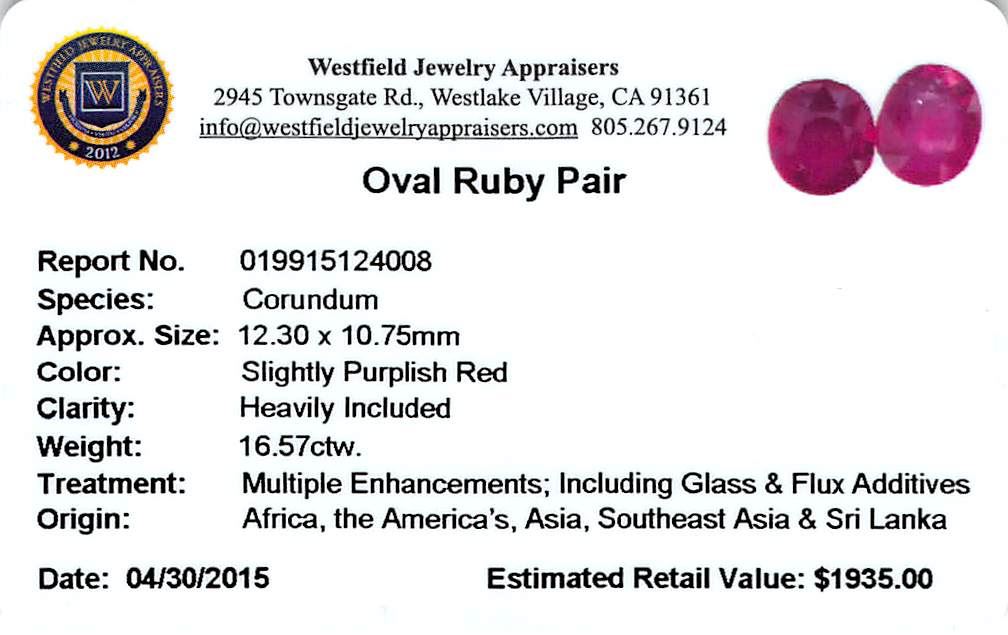Two oval mixed cut natural rubies, measuring 12.30 x 10.75 x 6.40mm, approximate total weight of 16.57ct., clarity is heavily included, type II, dark, very slightly brownish, slightly purplish red color, (GIA slpR 7/3), cut is good. Transmitting light somewhat diffusely, translucent. Naturally occurring internal & external characteristics are present. Indications of laboratory high temperature heat treatment, with glass & flux additives. Ruby has a low tolerance to rhodium plating, repolishing the surface, & ultrasonic cleaning. Westfield Appraised at $1,935.00.