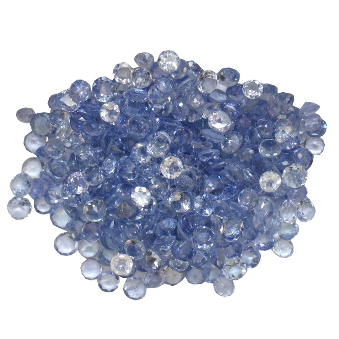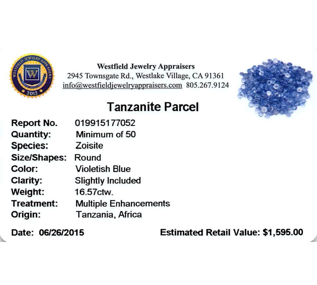 Fifty round mixed cut natural tanzanites, measuring 2.00 - 2.00 x 1.30 mm, exact total weight 16.57ct., clarity is slightly included, type I, medium, very slightly grayish, violetish blue color, (GIA vB 5/3), cut is good. Measurements & the color grade are an average for the group, Color grade is an average for the group, Transmitting light with no distortion, transparent, Naturally occurring internal & external characteristics are present, Indications of multiple laboratory enhancements, including high temperature heat treatment. Westfield Appraised at $1,595.00.