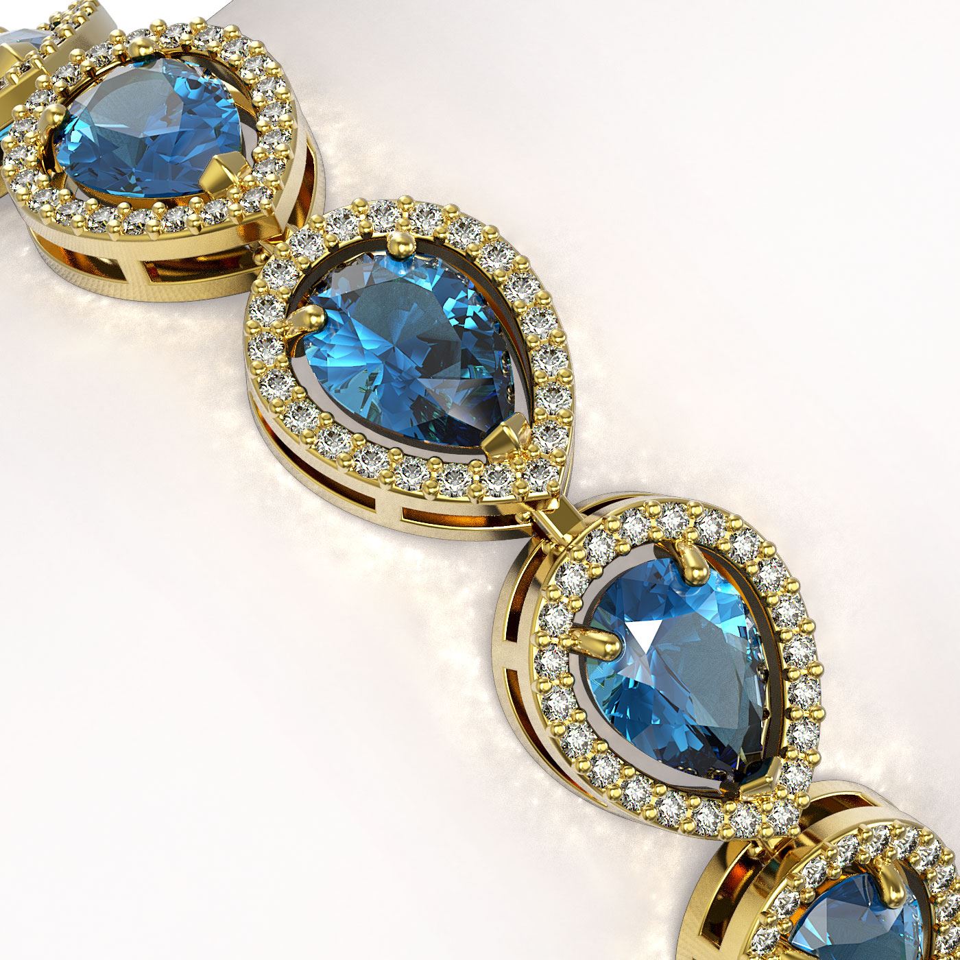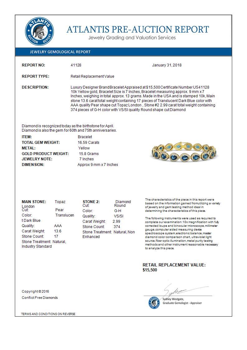 REF-281H6A -41128 ---- 16.59 CTW London Topaz & Diamond Halo Bracelet 10K Yellow Gold ---- Luxury Designer Brand Bracelet Appraised at $15,500 Certificate Number US41128 10k Yellow gold, Bracelet Size is 7 Inches, Bracelet measuring approx. 9 mm x 7 Inches, weighing in total approx. 13 grams. Made in the USA and is stamped 10k, Main stone 13.6 carat total weight containing 17 pieces of Translucent Dark Blue color with AAA quality Pear shape cut Topaz London , Stone #2 2.99 carat total weight containing 374 pieces of G-H color with VS/SI quality Round shape cut Diamond