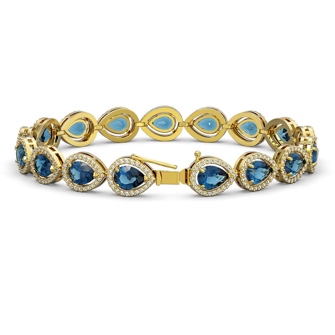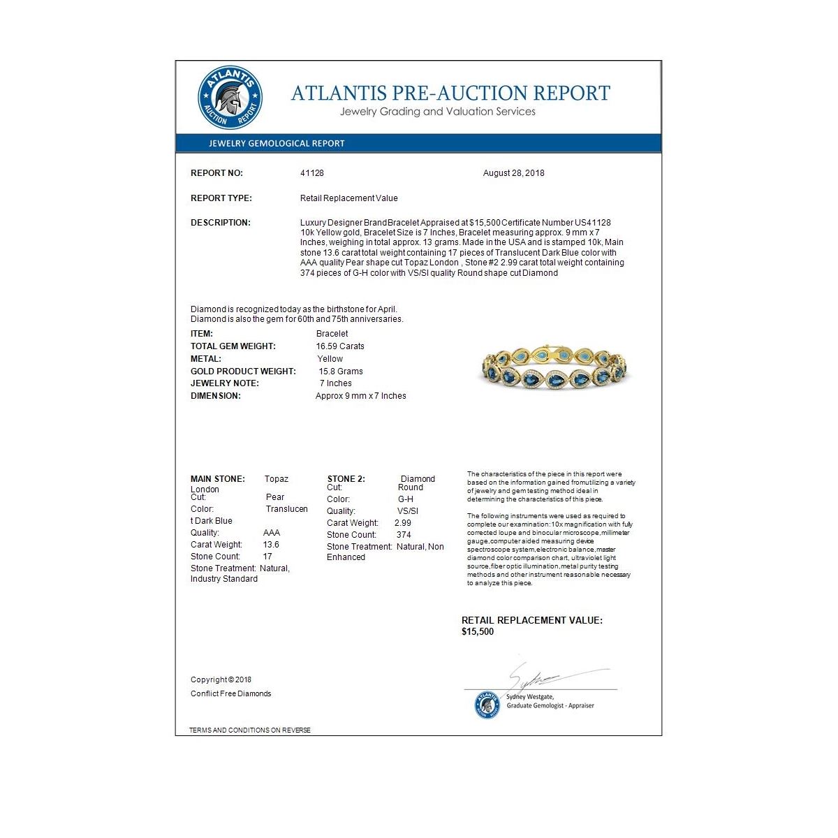 REF-281H6A -41128 ---- 16.59 CTW London Topaz & Diamond Halo Bracelet 10K Yellow Gold ---- Luxury Designer Brand Bracelet Appraised at $15,500 Certificate Number US41128 10k Yellow gold, Bracelet Size is 7 Inches, Bracelet measuring approx. 9 mm x 7 Inches, weighing in total approx. 13 grams. Made in the USA and is stamped 10k, Main stone 13.6 carat total weight containing 17 pieces of Translucent Dark Blue color with AAA quality Pear shape cut Topaz London , Stone #2 2.99 carat total weight containing 374 pieces of G-H color with VS/SI quality Round shape cut Diamond