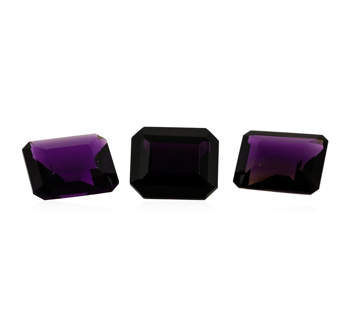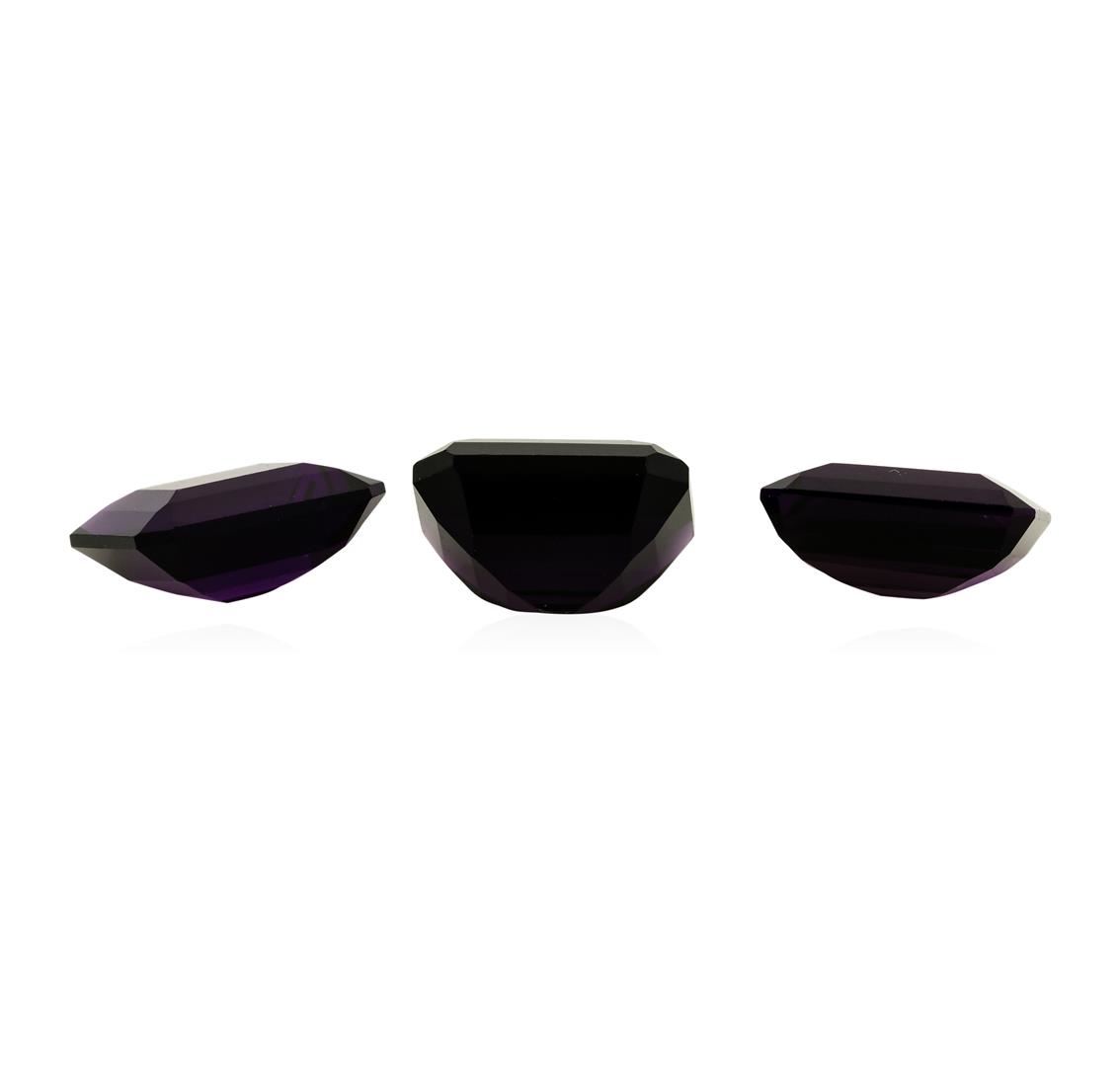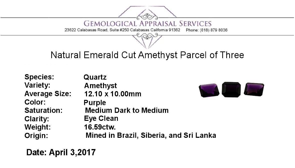 One natural emerald cut amethyst parcel of three with an exact weight of 16.59ctw., clarity is eye clean, purple, medium dark to medium. Gemological Appraisals Services estimates the retail value at $564.06 GAS Appraised.