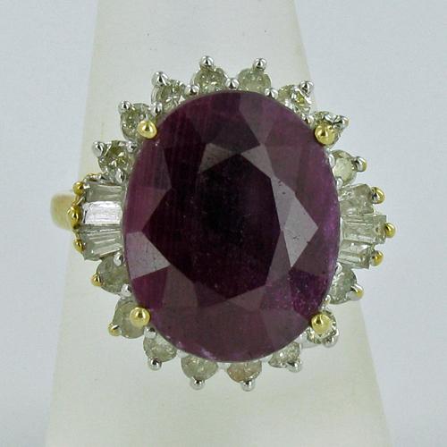 New large high grade ruby encircled by 22 white/yellow diamonds all set in 14k gold; 17mm
