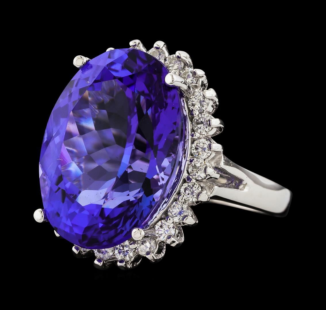 One electronically tested 14KT white gold lady's cast fashion ring with a split shank basket halo with a bright polish finish. The featured lady's ring has a shank measuring 2.38 millimeters wide. Identified with markings of '14K'. Condition is new, good workmanship. Containing: One prong set oval modified brilliant cut natural tanzanite, measuring 18.18 x 13.33 x 9.89mm, (depth est.) approximate weight of 16.60ct., clarity is eye clean, medium dark, strong, violetish blue color, (GIA vB 6/5), cut is very good. Transmitting light with no distortion, transparent. Colored gemstones are presumed to have been subjected to commonly used enhancement processes. Graded in the setting. Twenty-Four prong set round brilliant cut diamonds, measuring 2.00 - 1.90 x 1.19mm (depth est.) approximate total weight of 24 Stones = 0.66ct. Graded in the setting. Clarity SI-1 to SI-2. Color: G - I Cut Good. Total Weight of Colored Stones 16.60ct.. Total Weight of Diamonds 0.66ct.. Total Weight of Ring 9.60gm GAS Appraised at $23,675.00.