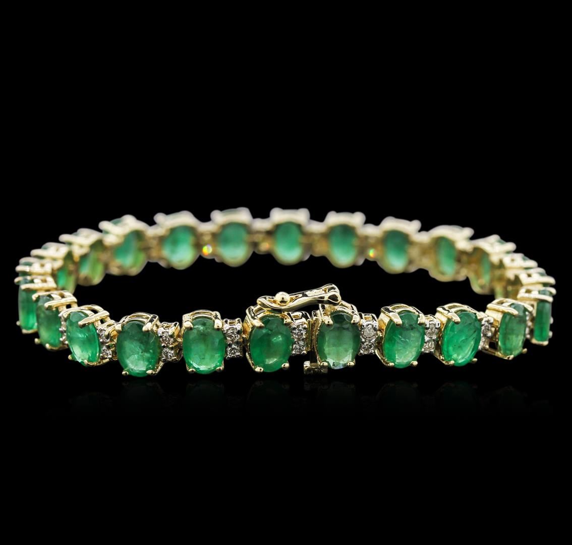 One stamped & tested 14KT yellow gold lady's combination cast & assembled bracelet with a safety clasp with a bright polish finish. Condition is new. 7" in length. Identified with markings of "14K". Containing: Twenty-four prong set oval mixed cut natural emeralds, measuring 7.10 x 5.05 x 3.54mm, approximate total weight of 16.63ct., clarity is heavily included, type III, medium, very slightly grayish, very slightly bluish green color, (GIA vslbG 5/3), cut is good. Colored gemstones are presumed to have been subjected to commonly used enhancement processes. Graded in setting. Forty-eight prong set round brilliant cut diamonds, measuring 1.75 - 1.65 x 1.02mm (depth est.) approximate total weight of 48 Stones = 0.82ct. Graded in setting. Clarity: SI-1 to I-1. Color: H - I. Cut: Good. Total Weight of Colored Stones: 16.63ct. Total Weight of Diamonds: 0.82ct. Total Weight of Bracelet: 17.30 gm. GAS Appraised at $6,965.00.