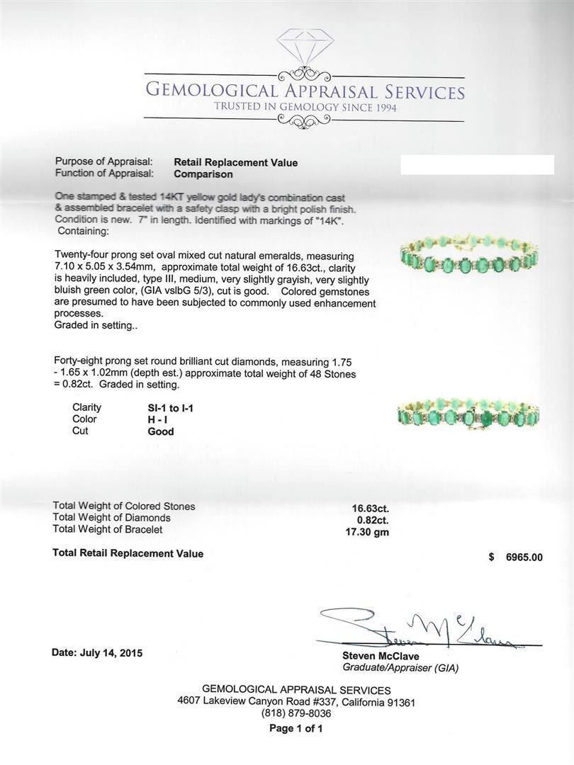 One stamped & tested 14KT yellow gold lady's combination cast & assembled bracelet with a safety clasp with a bright polish finish. Condition is new. 7" in length. Identified with markings of "14K". Containing: Twenty-four prong set oval mixed cut natural emeralds, measuring 7.10 x 5.05 x 3.54mm, approximate total weight of 16.63ct., clarity is heavily included, type III, medium, very slightly grayish, very slightly bluish green color, (GIA vslbG 5/3), cut is good. Colored gemstones are presumed to have been subjected to commonly used enhancement processes. Graded in setting. Forty-eight prong set round brilliant cut diamonds, measuring 1.75 - 1.65 x 1.02mm (depth est.) approximate total weight of 48 Stones = 0.82ct. Graded in setting. Clarity: SI-1 to I-1. Color: H - I. Cut: Good. Total Weight of Colored Stones: 16.63ct. Total Weight of Diamonds: 0.82ct. Total Weight of Bracelet: 17.30 gm. GAS Appraised at $6,965.00.
