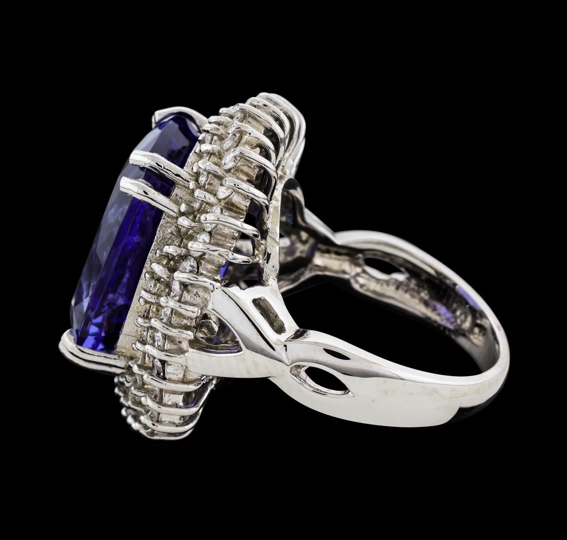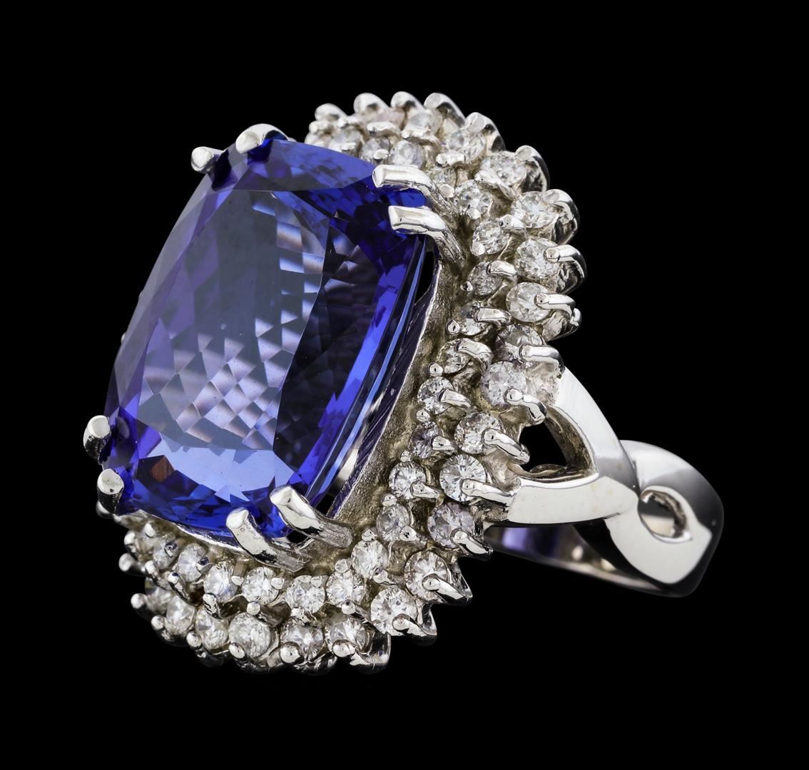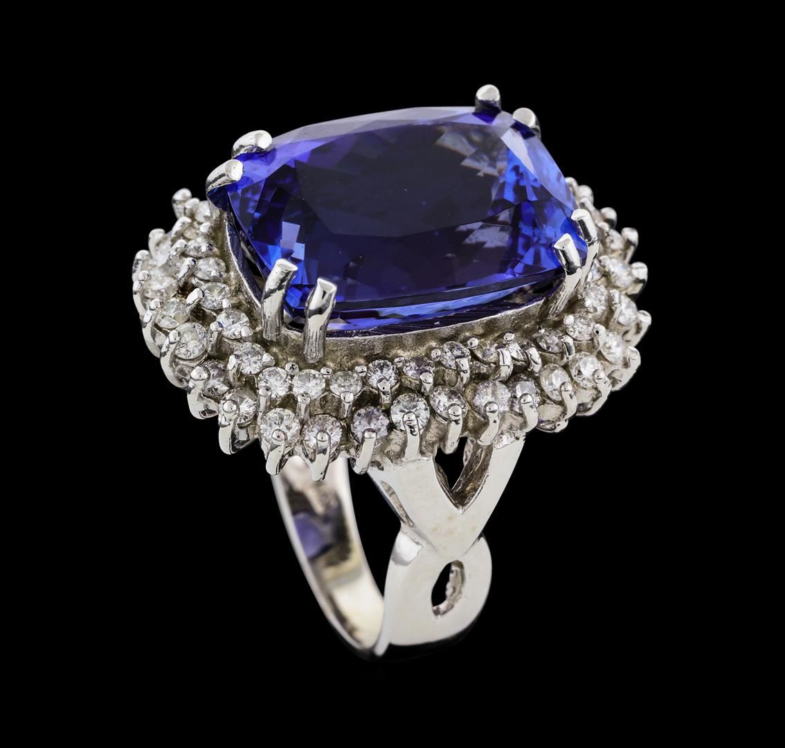 One electronically tested 14KT white gold lady's cast fashion ring with a double basket halo with a bright polish finish. The featured lady's ring has a cathedral shank measuring 3.15 millimeters wide. Identified with markings of 'K14'. Condition is new, good workmanship. Containing: One prong set rectangular cushion modified brilliant cut natural tanzanite, measuring 16.70 x 12.85 x 9.10mm, (depth est.) 8%. bulge factor, approximate weight of 16.64ct., clarity is eye clean, medium dark, strong, violetish blue color, (GIA vB 6/5), cut is very good. Transmitting light with no distortion, transparent. Colored gemstones are presumed to have been subjected to commonly used enhancement processes. Graded in the setting. Thirty-Two prong set round brilliant cut diamonds, measuring 1.95 - 1.85 x 1.18mm (depth est.) approximate total weight of 32 Stones = 0.87ct. Graded in the setting. Clarity SI-1 to I-1. Color: I - J Cut Good Thirty-Two prong set round brilliant cut diamonds, measuring 1.70 - 1.60 x 0.99mm (depth est.) approximate total weight of 32 Stones = 0.52ct. Graded in the setting. Clarity SI-1 to I-1. Color: I - J Cut Good. Total Weight of Colored Stones 16.64ct.. Total Weight of Diamonds 1.39ct.. Total Weight of Ring 14.00gm. GAS Appraised at $25,310.00.