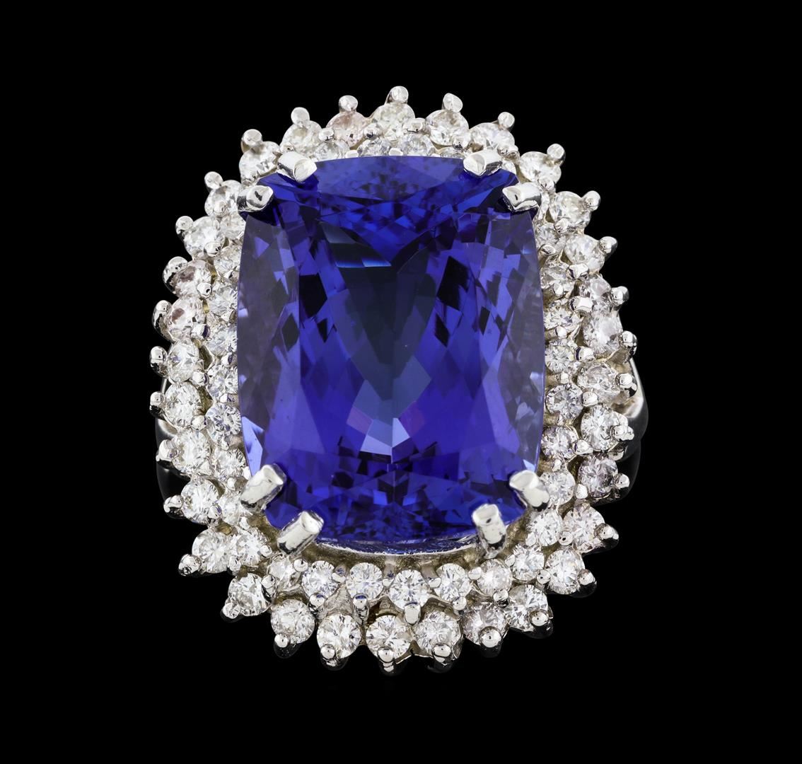 One electronically tested 14KT white gold lady's cast fashion ring with a double basket halo with a bright polish finish. The featured lady's ring has a cathedral shank measuring 3.15 millimeters wide. Identified with markings of 'K14'. Condition is new, good workmanship. Containing: One prong set rectangular cushion modified brilliant cut natural tanzanite, measuring 16.70 x 12.85 x 9.10mm, (depth est.) 8%. bulge factor, approximate weight of 16.64ct., clarity is eye clean, medium dark, strong, violetish blue color, (GIA vB 6/5), cut is very good. Transmitting light with no distortion, transparent. Colored gemstones are presumed to have been subjected to commonly used enhancement processes. Graded in the setting. Thirty-Two prong set round brilliant cut diamonds, measuring 1.95 - 1.85 x 1.18mm (depth est.) approximate total weight of 32 Stones = 0.87ct. Graded in the setting. Clarity SI-1 to I-1. Color: I - J Cut Good Thirty-Two prong set round brilliant cut diamonds, measuring 1.70 - 1.60 x 0.99mm (depth est.) approximate total weight of 32 Stones = 0.52ct. Graded in the setting. Clarity SI-1 to I-1. Color: I - J Cut Good. Total Weight of Colored Stones 16.64ct.. Total Weight of Diamonds 1.39ct.. Total Weight of Ring 14.00gm. GAS Appraised at $25,310.00.