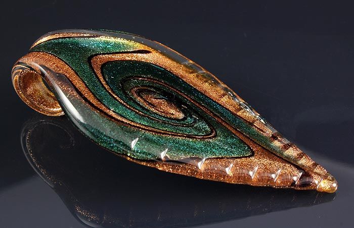 16.64GRAMS GLITTER QUARTZ GLASS FILLED LEAF PENDANT **|**|** 2.60X1.34 INCHES GOLD & GREEN GLITTER QUARTZ IN GLASS FILLED LEAF PENDANT ; MSRP: $100