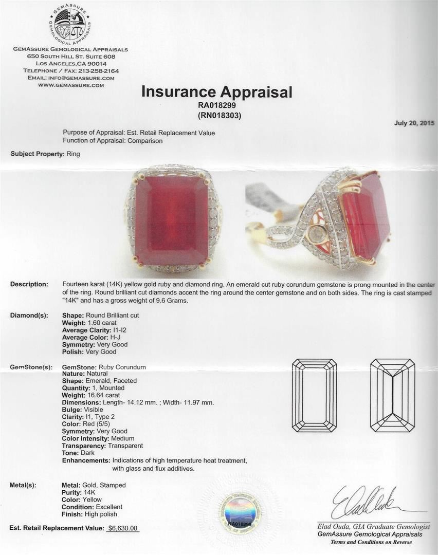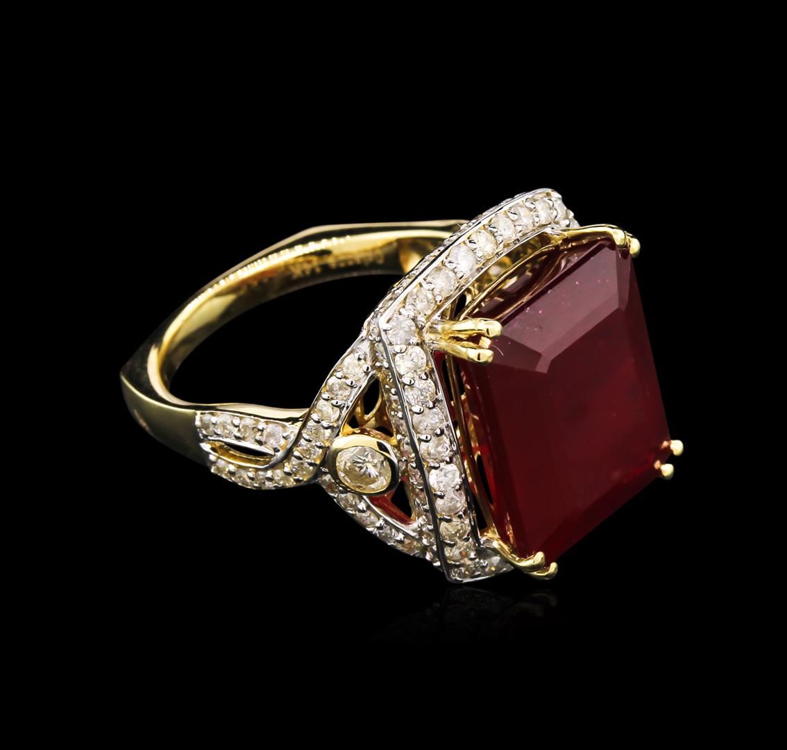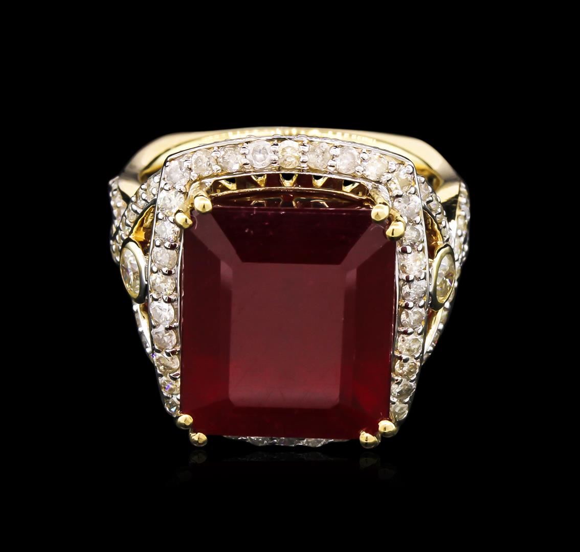 Fourteen karat (14) yellow gold ruby and diamond ring. An emerald cut ruby corundum gemstone is prong mounted in the center of the ring. Round brilliant cut diamonds accent the ring around the center gemstone and on both sides. The ring is cast stamped "14K" and has a gross weight of 9.6 Grams. Diamond(s): Shape: Round Brilliant cut. Weight: 1.60 carat. Average Clarity: I1-I2. Average Color H-J. Symmetry: Very Good. Polish: Very Good. Gemstone(s): Shape: Ruby Corundum. Nature: Natural. Shape: Emerald, Faceted. Quantity: 1, Mounted. Weight: 16.64 carat. Dimensions: Length- 14.12 mm. ; Width- 11.97 mm. Bulge: Visible. Clarity: I1, Type 2. Color: Red (5/5). Symmetry: Very Good. Color Intensity: Medium. Transparency: Transparent. Tone: Dark. Enhancements: Indications of high temperature heat treatment, with glass and flux additives. Metal(s): Metal: Gold, Stamped. Purity: 14K. Color: Yellow. Condition: Excellent. Finish: High polish. GGA Appraised at $6,630.00.