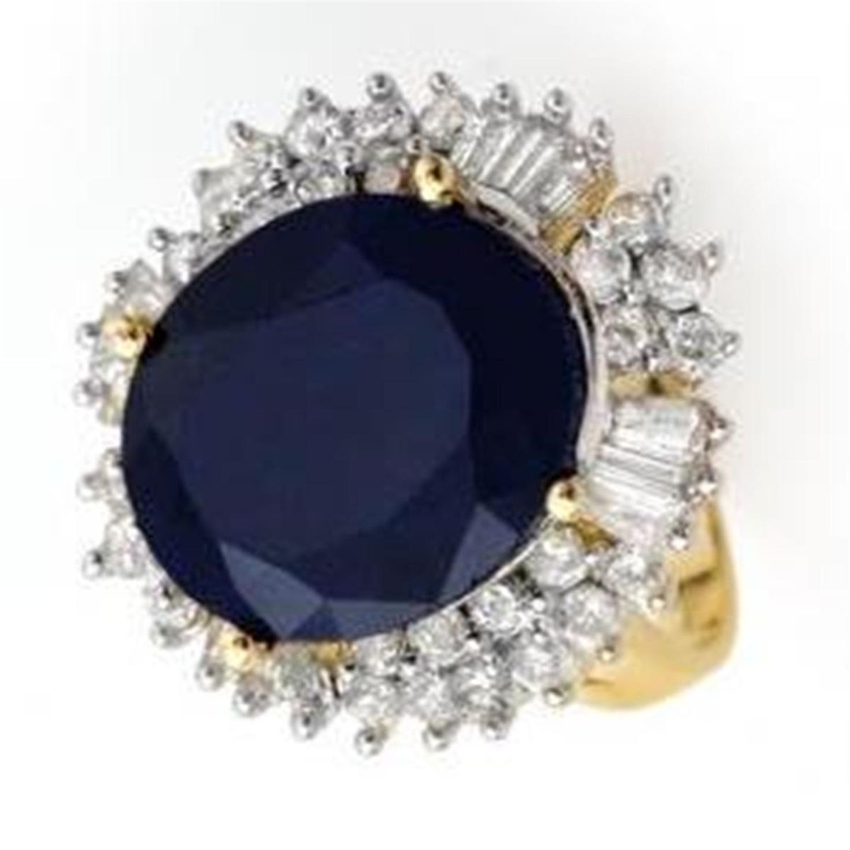 Diamond: 30 RD & BGT cut @ 1.75 ctw Clarity: SI-I Color: H-K Gemstone: Natural Sapphire Gemstone color: BlueGemstone quality: Good-to-Very Good Gemstone Cut & Weight: 1 Oval cut @ 14.91 ctw Metal Purity & Color : 14K Gold-Yellow Gold weight: 9.30 grams Ring size (US): 7.5Dimension: Approx. 1" x 15/16"