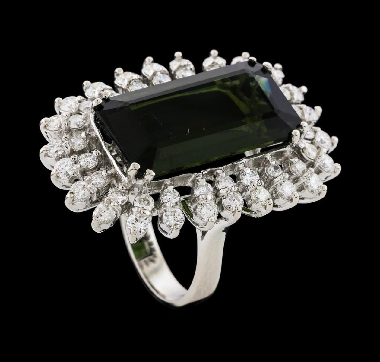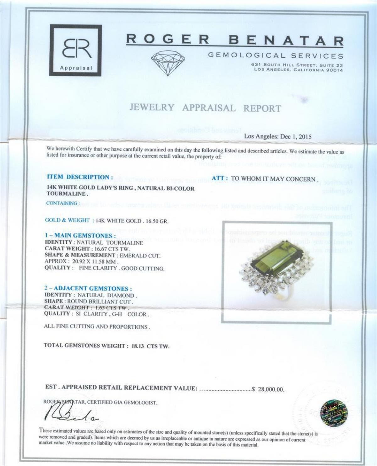 One 14KT White Gold Lady's Ring, Natural Bi-Color Tourmaline. Containing: Gold & Weight: 14KT White Gold: 16.50 grams. Main Gemstones: Identity: Natural Tourmaline, Carat Weight: 16.67cts tw, Shape & Measurement: Emerald Cut. Approximately: 20.92 x 11.58mm, Quality: Fine Clarity. Good Cutting. Adjacent Gemstones: Identity: Natural Diamond, Shape: Round Brilliant Cut, Carat Weight: 1.63 cts tw, Quality: SI Clarity. G-H Color. All fine cutting and proportions. Total Gemstones weight: 18.13 cts tw. RBGS Appraised.