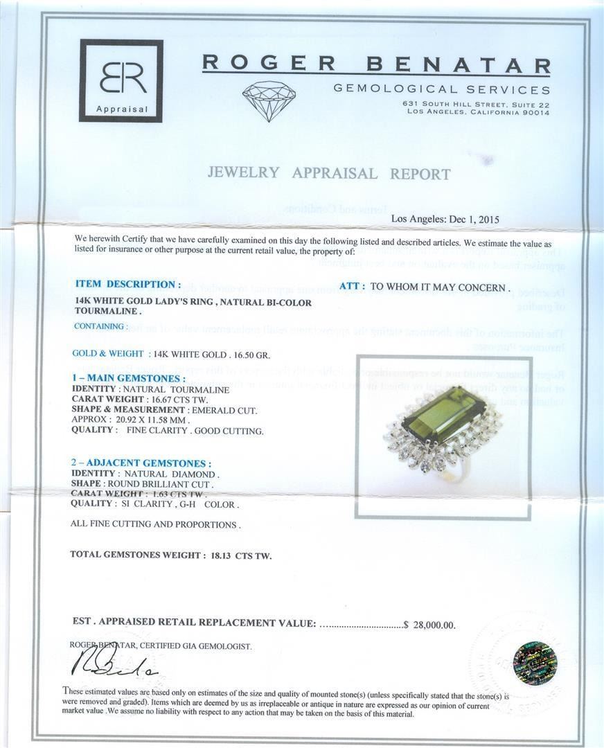 One 14KT White Gold Lady's Ring, Natural Bi-Color Tourmaline. Containing: Gold & Weight: 14KT White Gold: 16.50 grams. Main Gemstones: Identity: Natural Tourmaline, Carat Weight: 16.67cts tw, Shape & Measurement: Emerald Cut. Approximately: 20.92 x 11.58mm, Quality: Fine Clarity. Good Cutting. Adjacent Gemstones: Identity: Natural Diamond, Shape: Round Brilliant Cut, Carat Weight: 1.63 cts tw, Quality: SI Clarity. G-H Color. All fine cutting and proportions. Total Gemstones weight: 18.13 cts tw. RBGS Appraised.