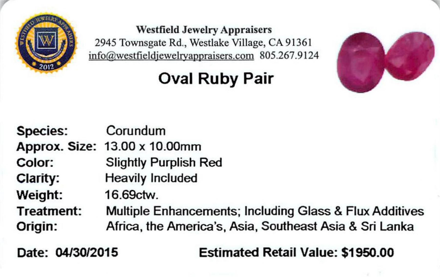 Two oval mixed cut natural rubies, measuring 13.00 x 10.00 x 6.51mm, exact total weight 16.69ct., clarity is heavily included, type II, medium dark, very slightly brownish, slightly purplish red color, (GIA slpR 6/3), cut is good. Transmitting light somewhat diffusely, translucent. Naturally occurring internal & external characteristics are present. Indications of laboratory high temperature heat treatment, with glass & flux additives. Ruby has a low tolerance to rhodium plating, repolishing the surface, & ultrasonic cleaning. Westfield Appraised.