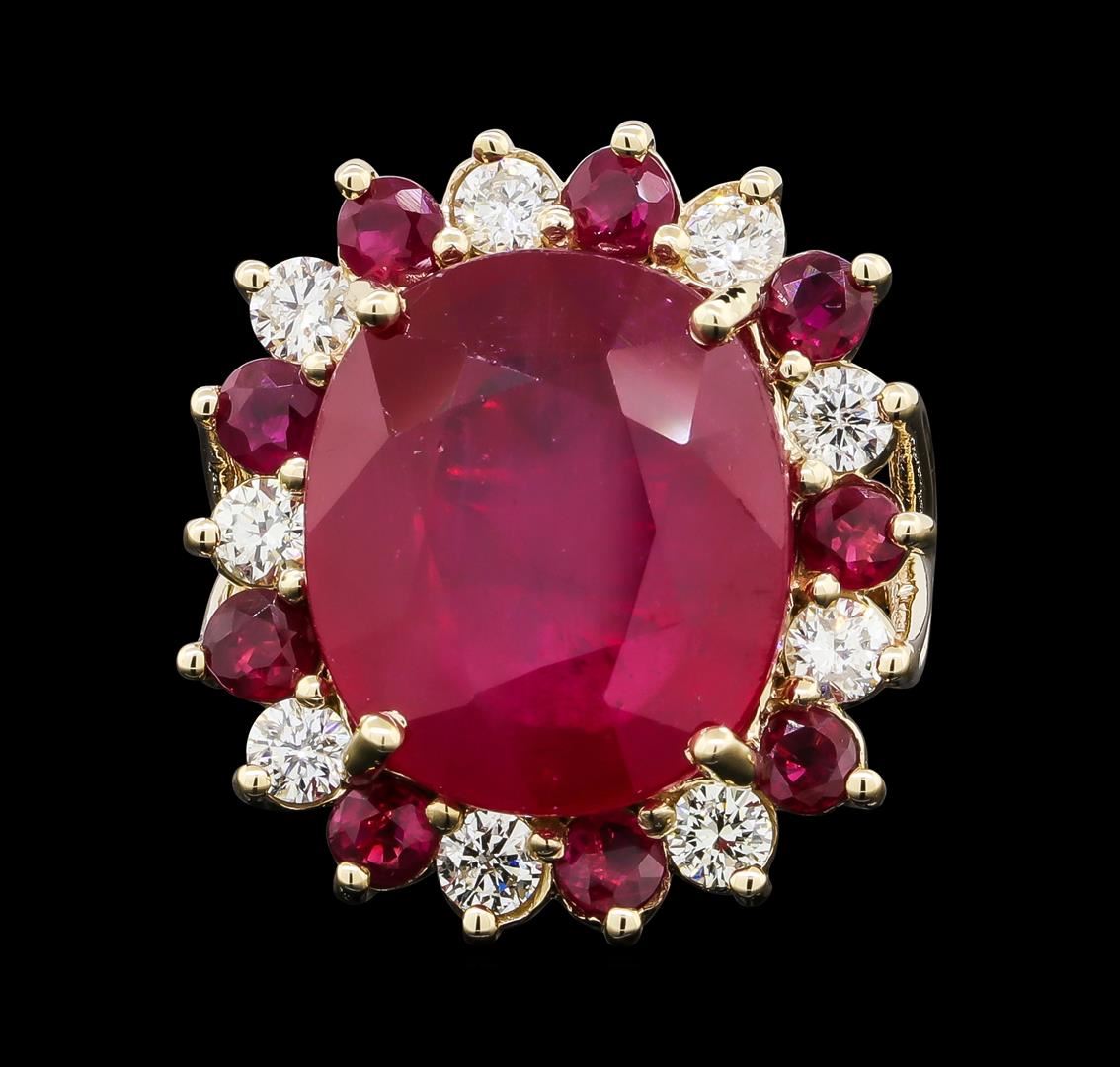One electronically tested 14KT yellow gold lady's cast fashion ring with a basket halo with a bright polish finish. The featured lady's ring has a shank measuring 2.54 millimeters wide. Identified with markings of '14K'. Condition is new, good workmanship. Containing: One prong set oval modified brilliant cut natural ruby, measuring 15.67 x 13.45 x 6.95mm, (depth est.) 22%. bulge factor, approximate weight of 15.10ct., clarity is heavily included, medium dark, moderately strong, slightly purplish red color, (GIA slpR 6/4), cut is good. Transmitting light somewhat diffusely, semi-transparent to translucent. Naturally occurring internal & external characteristics are present. Indications of laboratory high temperature heat treatment, with glass & flux additives. Colored gemstones are presumed to have been subjected to commonly used enhancement processes. Graded in the setting. Nine prong set round modified brilliant cut natural rubies, measuring 3.20 - 3.10 x 2.05 mm, (depth est.) approximate total weight of 1.60ct., clarity is slightly included, medium dark, strong, red color, (GIA R 6/5), cut is good. Transmitting light with a minimum of distortion, transparent. Indications of laboratory high temperature heat treatment. Colored gemstones are presumed to have been subjected to commonly used enhancement processes. Graded in the setting. Nine prong set round brilliant cut diamonds, measuring 3.00 - 2.90 x 1.80mm (depth est.) approximate total weight of 9 Stones = 0.85ct. Graded in the setting. Clarity SI-1 to SI-2. Color: H - I Cut Good. Total Weight of Colored Stones 16.70ct.. Total Weight of Diamonds 0.85ct.. Total Weight of Ring 11.10gm. GAS Appraised at $9,510.00.