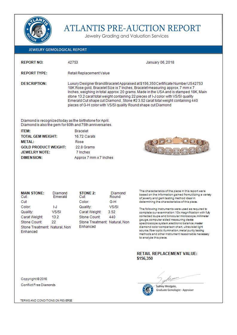 REF-3553K8W -42753 ---- 16.72 CTW Emerald Cut Diamond Designer Bracelet 18K Rose Gold ---- Luxury Designer Brand Bracelet Appraised at $156,350 Certificate Number US42753 18K Rose gold, Bracelet Size is 7 Inches, Bracelet measuring approx. 7 mm x 7 Inches, weighing in total approx. 20 grams. Made in the USA and is stamped 18K, Main stone 13.2 carat total weight containing 22 pieces of I-J color with VS/SI quality Emerald Cut shape cut Diamond , Stone #2 3.52 carat total weight containing 440 pieces of G-H color with VS/SI quality Round shape cut Diamond