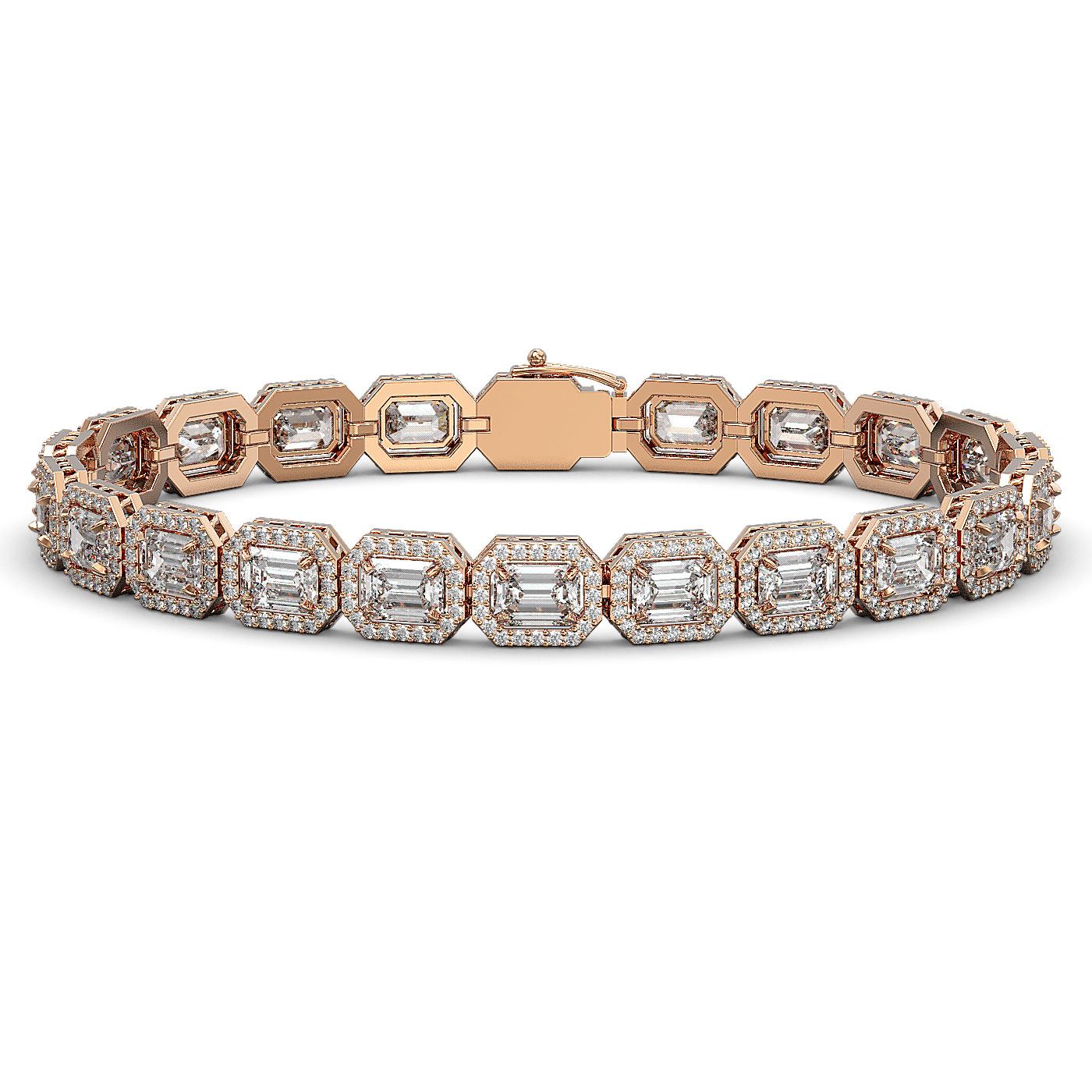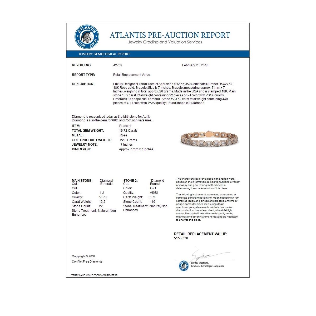 REF-3553K8W -42753 ---- 16.72 CTW Emerald Cut Diamond Designer Bracelet 18K Rose Gold ---- Luxury Designer Brand Bracelet Appraised at $156,350 Certificate Number US42753 18K Rose gold, Bracelet Size is 7 Inches, Bracelet measuring approx. 7 mm x 7 Inches, weighing in total approx. 20 grams. Made in the USA and is stamped 18K, Main stone 13.2 carat total weight containing 22 pieces of I-J color with VS/SI quality Emerald Cut shape cut Diamond , Stone #2 3.52 carat total weight containing 440 pieces of G-H color with VS/SI quality Round shape cut Diamond