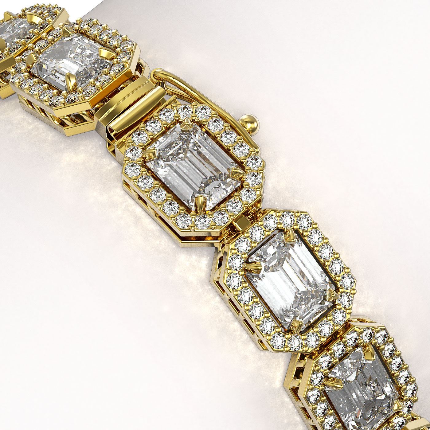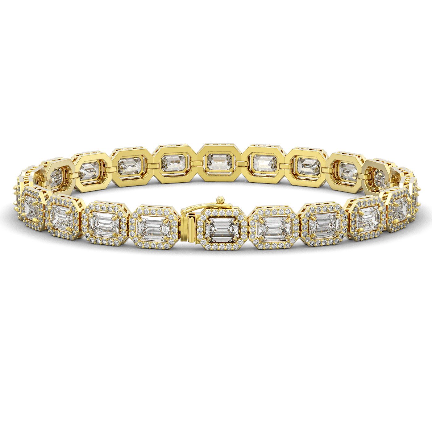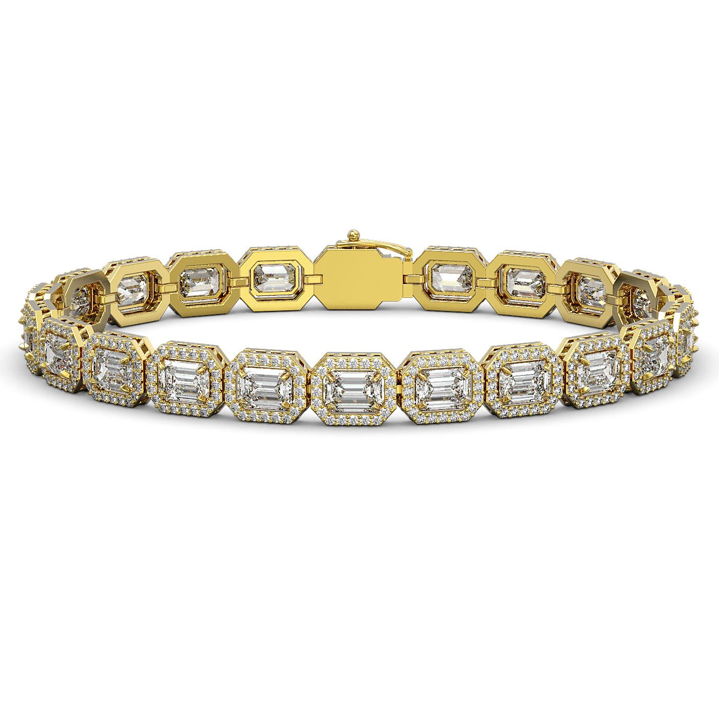 REF-3553W8F -42754 ---- 16.72 CTW Emerald Cut Diamond Designer Bracelet 18K Yellow Gold ---- Luxury Designer Brand Bracelet Appraised at $156,350 Certificate Number US42754 18K Yellow gold, Bracelet Size is 7 Inches, Bracelet measuring approx. 7 mm x 7 Inches, weighing in total approx. 20 grams. Made in the USA and is stamped 18K, Main stone 13.2 carat total weight containing 22 pieces of I-J color with VS/SI quality Emerald Cut shape cut Diamond , Stone #2 3.52 carat total weight containing 440 pieces of G-H color with VS/SI quality Round shape cut Diamond