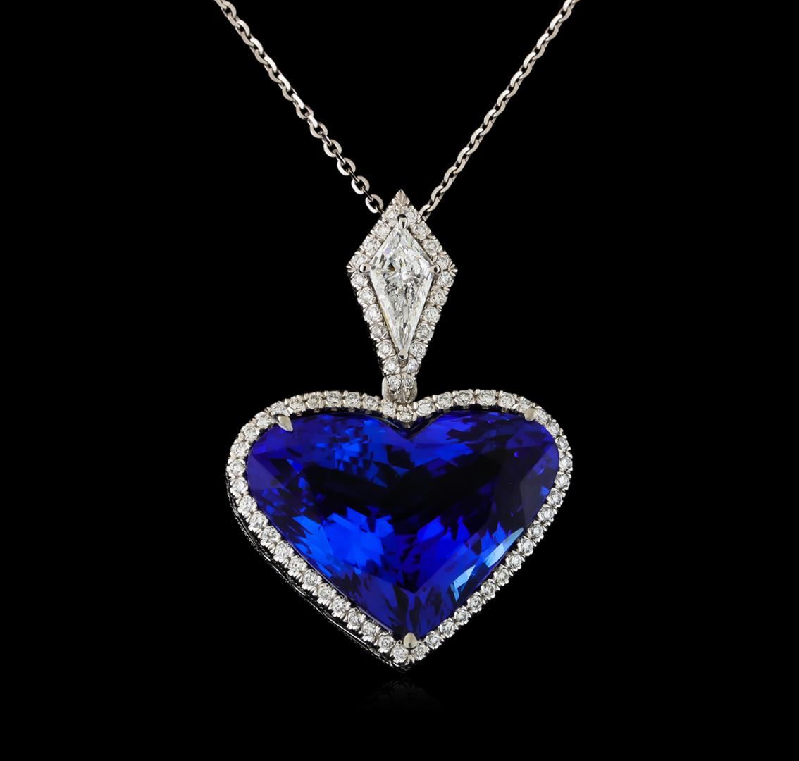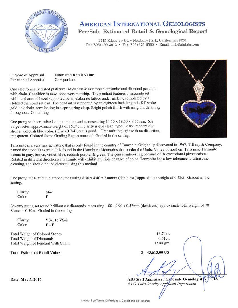 One electronically tested platinum ladies cast & assembled tanzanite and diamond pendant with chain. The pendant features a tanzanite set within a diamond bezel supported by an elaborate lattice under gallery, completed by a stylized diamond set bail. The pendant is supported by an eighteen inch length 14KT white gold link chain, terminating in a spring ring clasp. Bright polish finish with milgrain detailing throughout. Condition is new, good workmanship. Containing: One prong set heart mixed cut natural tanzanite, measuring 14.50 x 19.50 x 8.55mm, 6%. bulge factor, approximate weight of 16.74ct., clarity is eye clean, type I, dark, moderately strong, violetish blue color, (GIA vB 7/4), cut is good. Transmitting light with no distortion, transparent. Colored Stone Grading Report attached. Graded in the setting. Tanzanite is a very rare gemstone that is only found in the country of Tanzania. Originally discovered in 1967. Tiffany & Company, named the stone Tanzanite. It is found in the Usumburu Mountains that border the Umba Valley of northern Tanzania. Tanzanite occurs in gray, brown, violet, blue, reddish-purple, & green. The gem is interesting because of its exceptional pleochroism. Rotated in different directions a tanzanite will exhibit multiple changes of color. Tanzanite has a low tolerance to ultrasonic cleaning, and should not be cleaned using this method. One prong set Kite cut diamond, measuring 8.50 x 4.40 x 2.00mm (depth est.) approximate weight of 0.32ct. Graded in the setting. Clarity: SI-2. Color: F Seventy prong set round brilliant cut diamonds, measuring 1.00 - 0.90 x 0.57mm (depth est.) approximate total weight of 70 Stones = 0.30ct. Graded in the setting. Clarity: VS-1 to VS-2. Color: E - F. Total Weight of Colored Stones 16.74ct. Total Weight of Diamonds 0.62ct. Total Weight of Pendant With Chain 12.88gm. AIG Appraised at $45,615.00.