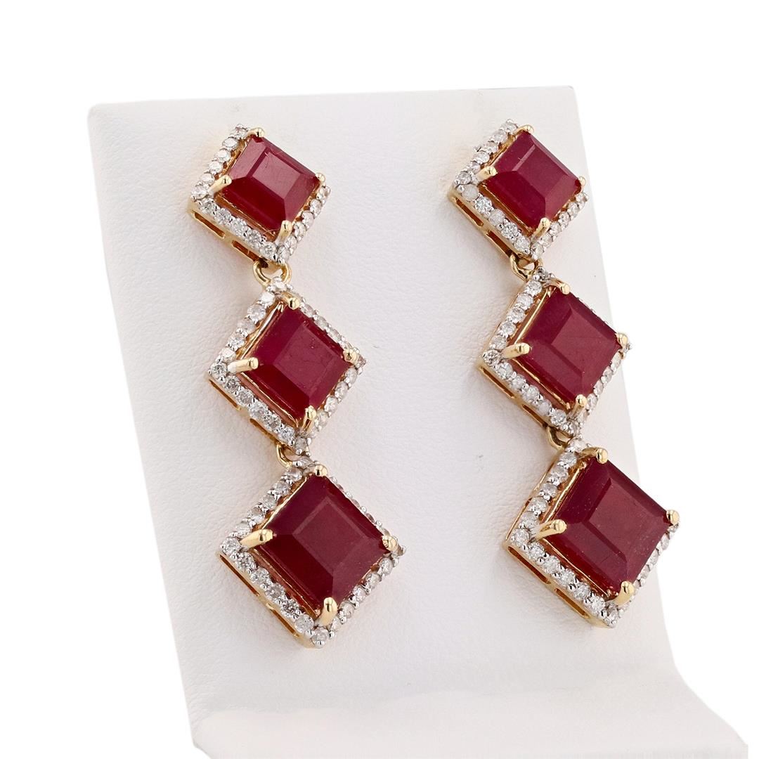 14K Gold Ruby and Diamond Earrings One polished, stamped, and tested pair of 14K yellow gold earrings with a bright finish. The earrings are mounted with: 6 faceted rubies weighing approximately 16.77 carats, and 140 faceted round diamonds weighing approximately 1.41 carats. This item weighs 10.1 grams, condition is new, excellent workmanship. MAIN GEMSTONES Species: Natural Corundum Variety: Ruby Shape: Square Cutting Style: Step Cut Quantity: 6 Rubies Measurements: 6x 6- 8x 8mm Total Weight: 16.77 carats Color: Red Cut Grade: Very Good Treatment: Fracture Filled Refractive Index: 1.762 - 1.770 DR Birefringence: 0.008 - 0.010 Hardness: 9 ADJACENT GEMSTONES ON EARRINGS Identity: Natural Diamond Shape: Round Cutting Style: Brilliant Cut Quantity: 140 Diamonds Measurements: 1.2 - 1.4 mm Total Weight: 1.41 carats Clarity Grade: I-1 to I-2 Color Grade: H-J Refractive Index: 2.418 Hardness: 10 TOTAL RUBY WEIGHT: 16.77 cts TOTAL DIAMOND WEIGHT: 1.41 cts WEIGHT OF ITEM: 10.1 grams GOLD CONTENT: 14K Yellow Gold