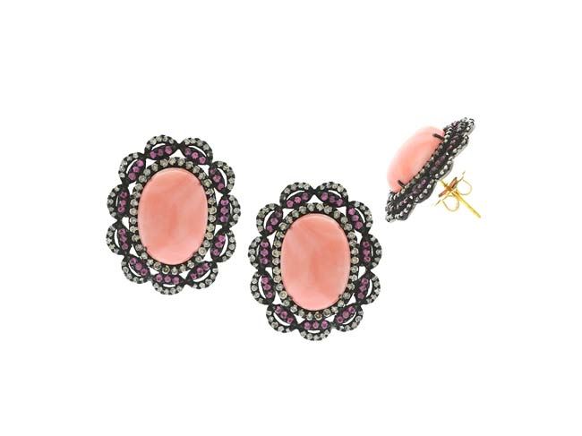 PINK SAPPHIRE, PEACH CORAL AND DIAMOND STUD EARRING/**/Diamond 1 CTW:1.37/Diamond Color & Clarity:J-L/I1-I2(Single Cut)/Diamond Count 2:/Diamond 2 CTW:/Diamond Color & Clarity:/Gemstone Count1:/Gemstone 1 CTW:15.53/Gemstone Count 2:/Gemstone 2 CTW:/Metal Type 1 Gold:18k Yellow Gold /Gold Gram Weight:1.92/Metal Type 2:over 0.925 Sterling Silver/Silver Gram Weight:5.6/Gross Weight: 10.9