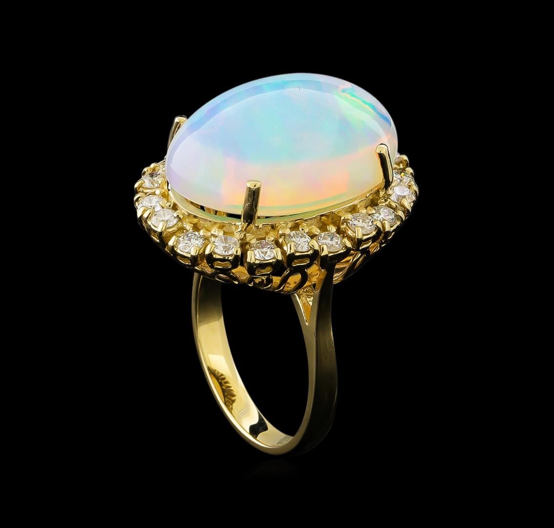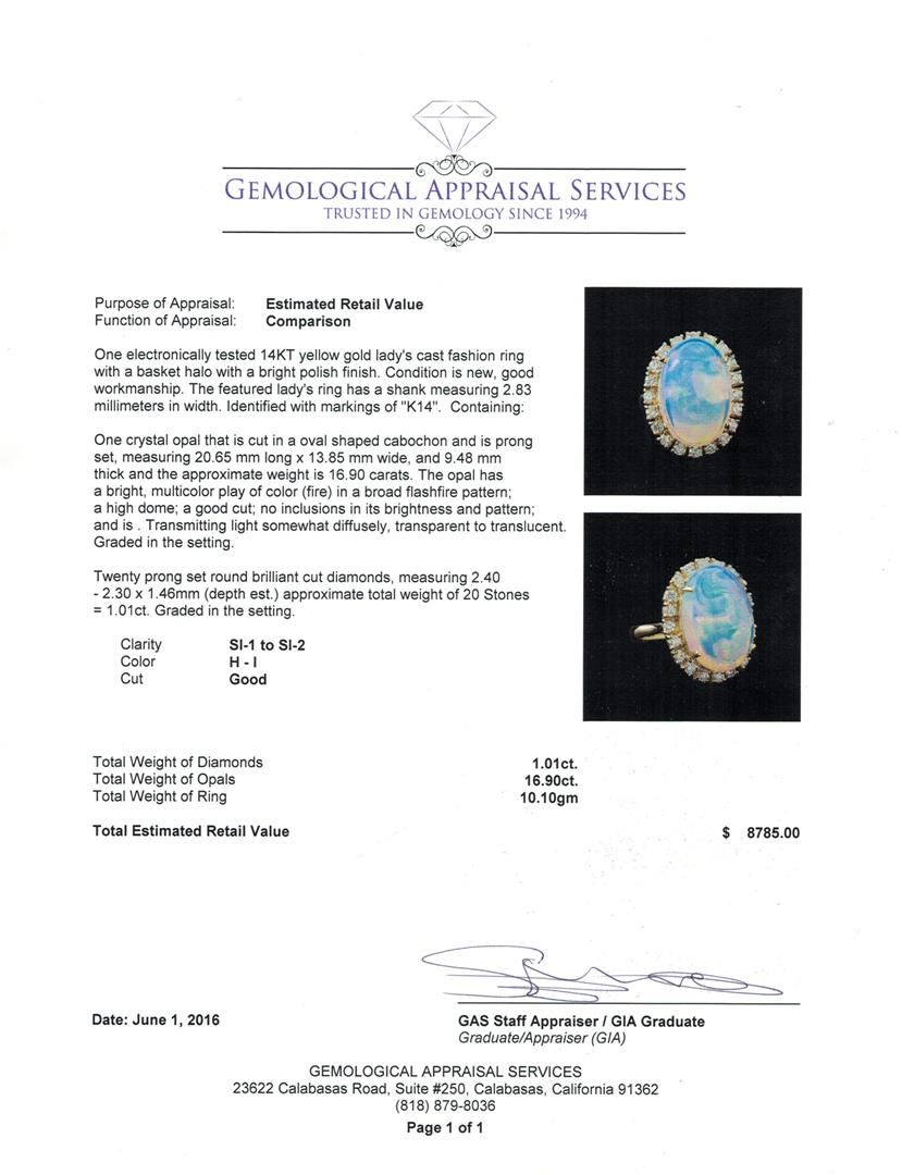 One electronically tested 14KT yellow gold lady's cast fashion ring with a basket halo with a bright polish finish. The featured lady's ring has a shank measuring 2.83 millimeters in width. Identified with markings of "K14". Condition is new, good workmanship. Containing: One crystal opal that is cut in a oval shaped cabochon and is prong set, measuring 20.65 mm long x 13.85 mm wide, and 9.48 mm thick and the approximate weight is 16.90 carats. The opal has a bright, multicolor play of color (fire) in a broad flashfire pattern; a high dome; a good cut; no inclusions in its brightness and pattern; and is. Transmitting light somewhat diffusely, transparent to translucent. Graded in the setting. Twenty prong set round brilliant cut diamonds, measuring 2.40 - 2.30 x 1.46mm (depth est.) approximate total weight of 20 Stones = 1.01ct. Graded in the setting. Clarity: SI-1 to SI-2. Color: H - I. Cut Good. Total Weight of Diamonds 1.01ct. Total Weight of Opals 16.90ct. Total Weight of Ring 10.10gm. GAS Appraised at $8,785.00.