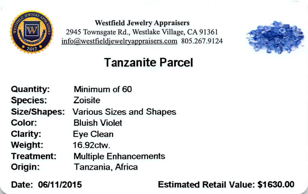 Sixty mixed cut natural tanzanites exact total weight 16.92ct., clarity is eye clean, type I, medium dark, very slightly grayish, bluish violet color, (GIA bV 6/3), cut is good.    Transmitting light with no distortion, transparent. Color grade is an average for the group. Graded in the setting. Tanzanite is a very rare gemstone that is only found in the country of Tanzania. Originally discovered in 1967. Tiffany & Company, named the stone Tanzanite. It is found in the Usumburu Mountains that border the Umba Valley of northern Tanzania. Tanzanite occurs in gray, brown, violet, blue, reddish-purple, & green. The gem is interesting because of its exceptional pleochroism. Rotated in different directions a tanzanite will exhibit multiple changes of color. Tanzanite has a low tolerance to ultrasonic cleaning, and should not be cleaned using this method. Westfield Appraised at $1,630.00.