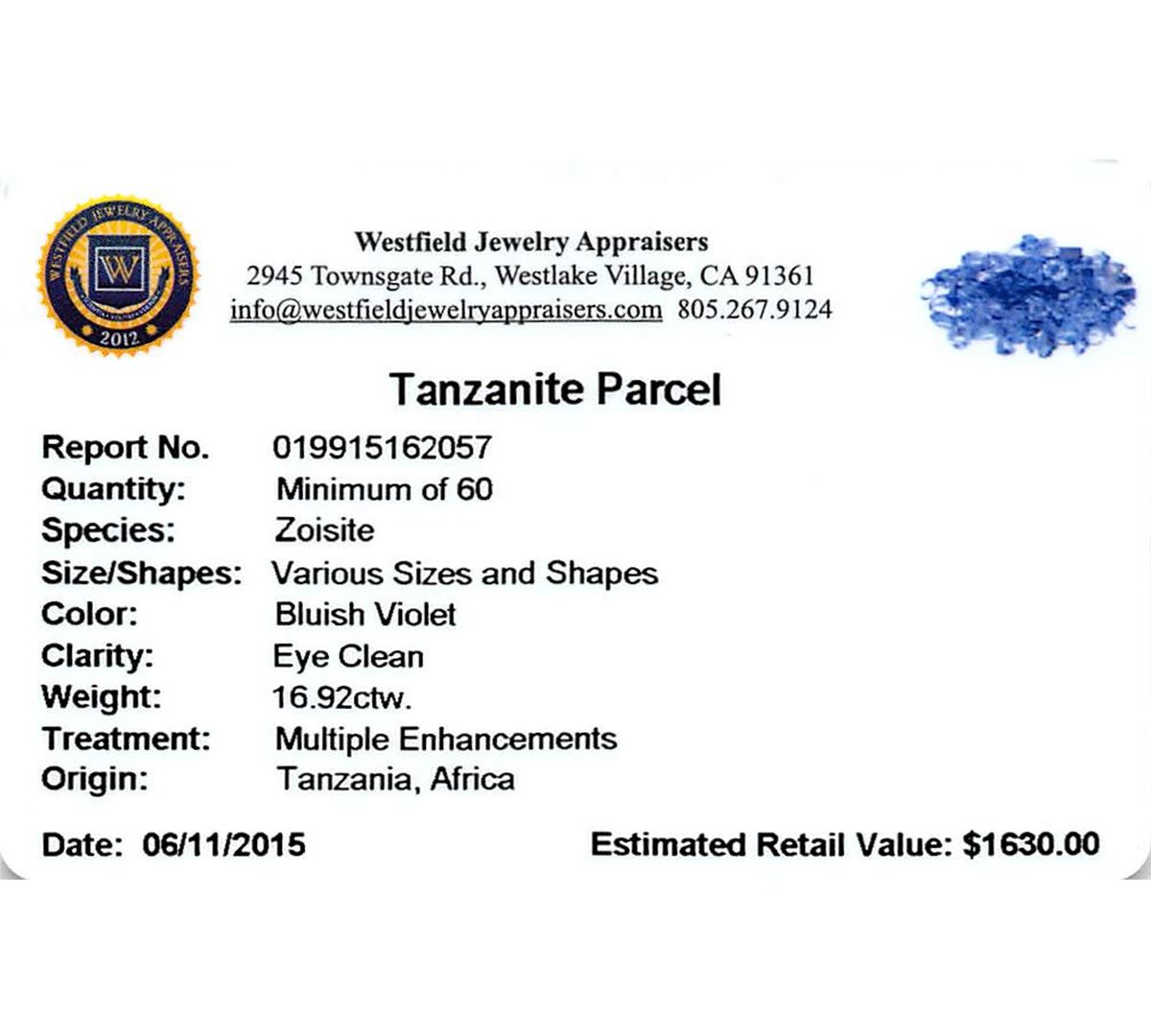 Sixty mixed cut natural tanzanites exact total weight 16.92ct., clarity is eye clean, type I, medium dark, very slightly grayish, bluish violet color, (GIA bV 6/3), cut is good. Transmitting light with no distortion, transparent. Color grade is an average for the group. Graded in the setting. Tanzanite is a very rare gemstone that is only found in the country of Tanzania. Originally discovered in 1967. Tiffany & Company, named the stone Tanzanite. It is found in the Usumburu Mountains that border the Umba Valley of northern Tanzania. Tanzanite occurs in gray, brown, violet, blue, reddish-purple, & green. The gem is interesting because of its exceptional pleochroism. Rotated in different directions a tanzanite will exhibit multiple changes of color. Tanzanite has a low tolerance to ultrasonic cleaning, and should not be cleaned using this method. Westfield Appraised at $1,630.00.