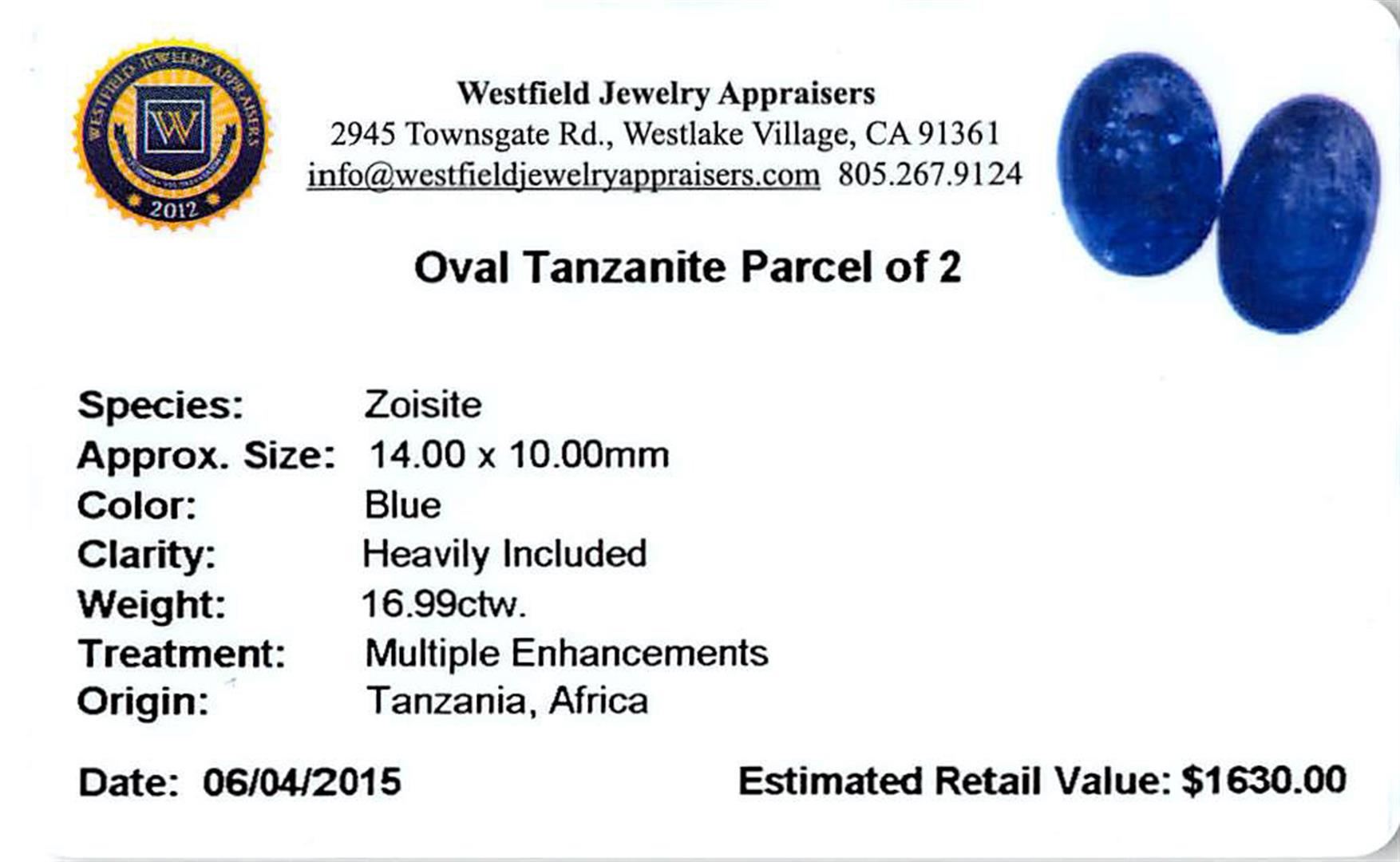 Two oval cabochon cut natural tanzanites, measuring 14.00 x 10.00 x 6.40mm, exact total weight 16.99ct., clarity is heavily included, type I, dark, moderately strong, blue color, (GIA B 7/4), cut is good. Measurements are an average for the pair. Transmitting light somewhat diffusely, transparent to translucent. Naturally occurring internal & external characteristics are present. Indications of heat treatment. Westfield Appraised at $1,630.00.
